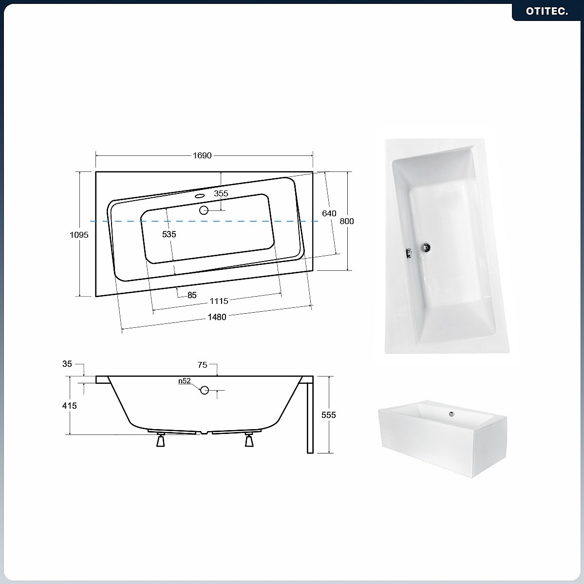 Baignoire asymétrique - 170 x 110 cm - Gauche - avec Tablier Blanc - Pieds - Vidage Chrome - INFINITY