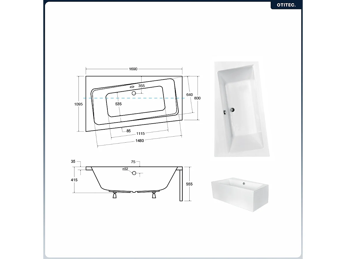 Baignoire asymétrique - 170 x 110 cm - Gauche - sans Habillage - avec Pieds - Vidage Chrome - INFINITY