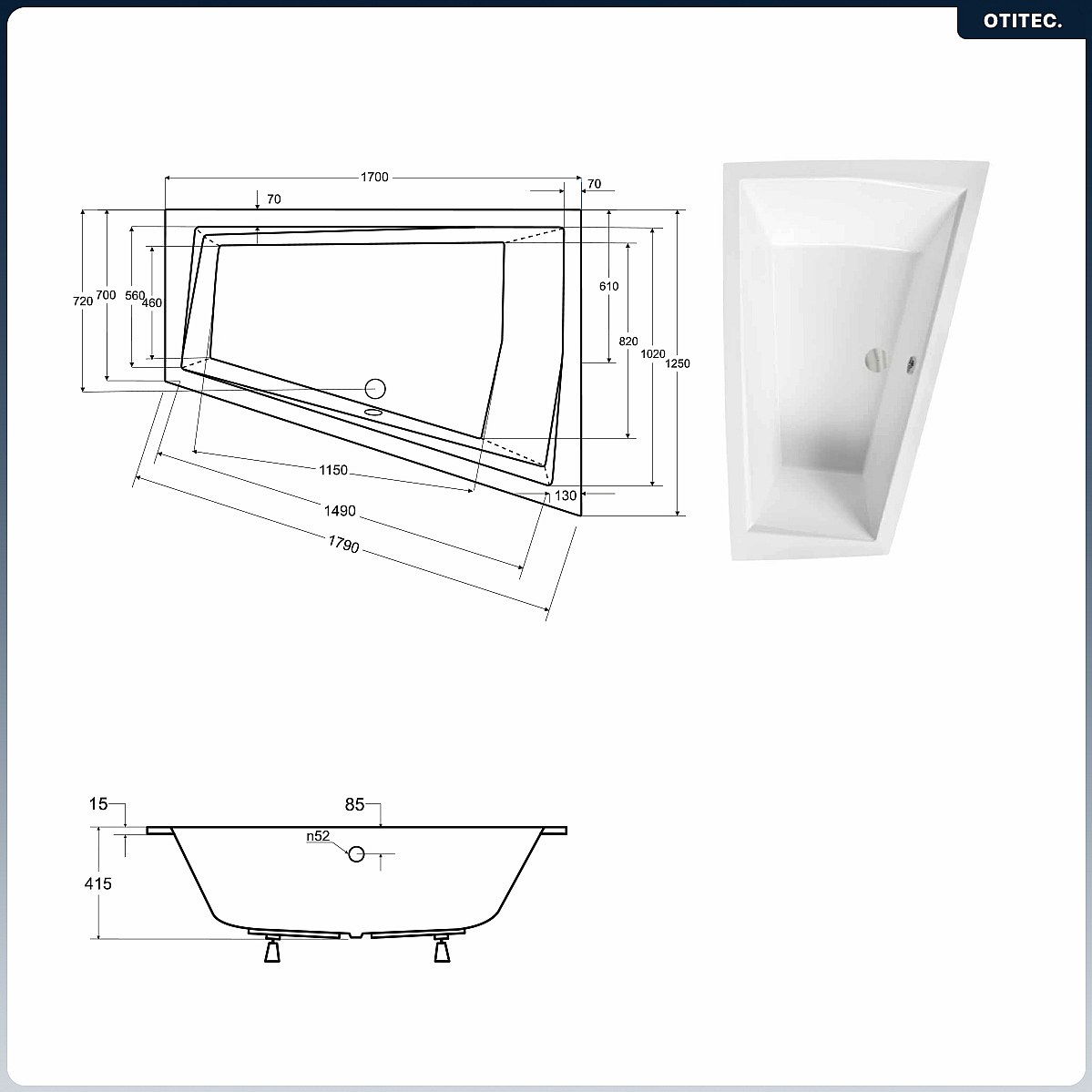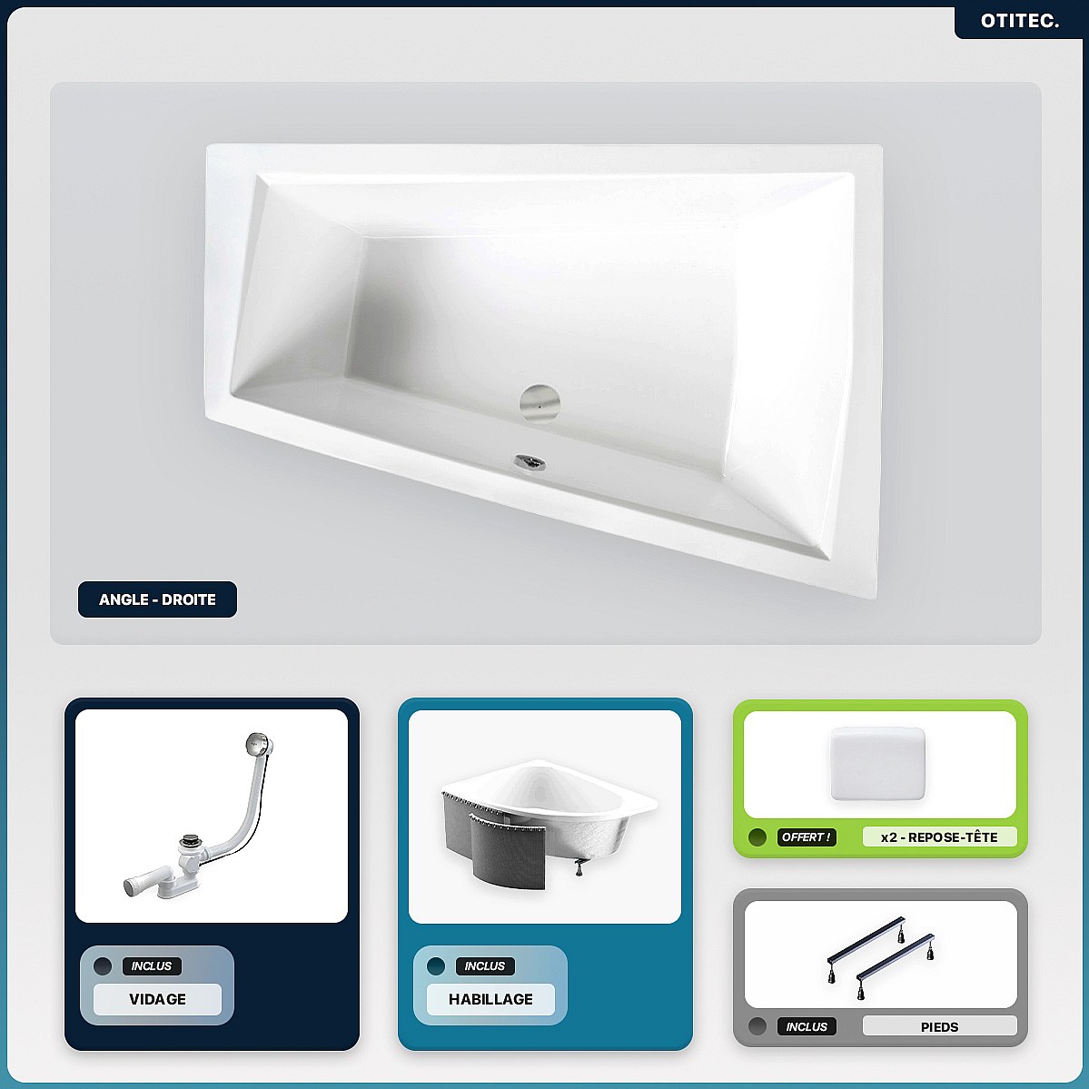 Baignoire asymétrique - 170 x 125 cm - Droite - avec Habillage - Pieds - 2 Repose-têtes - Vidage Chrome - INTIMA DUO SLIM