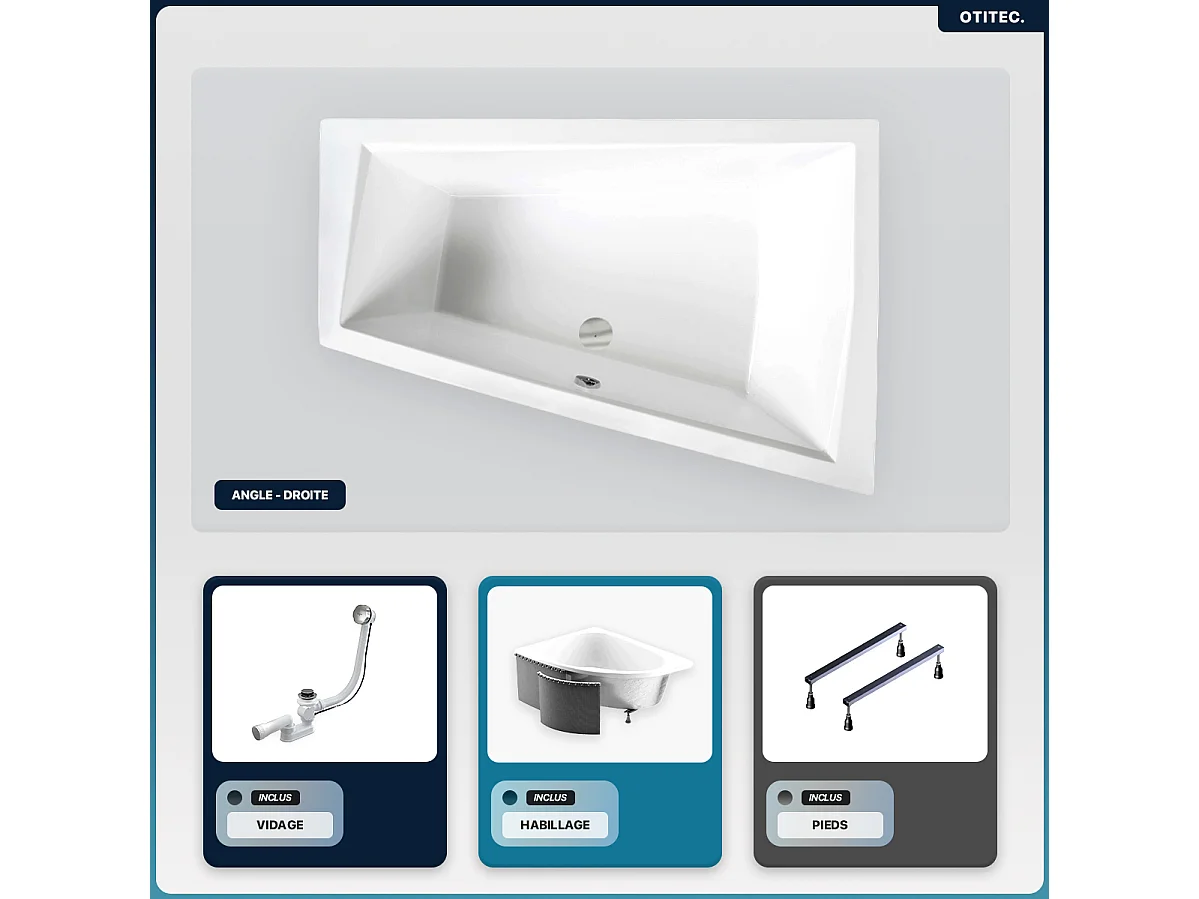 Baignoire asymétrique - 170 x 125 cm - Droite - avec Habillage - Pieds - Vidage Chrome - INTIMA DUO