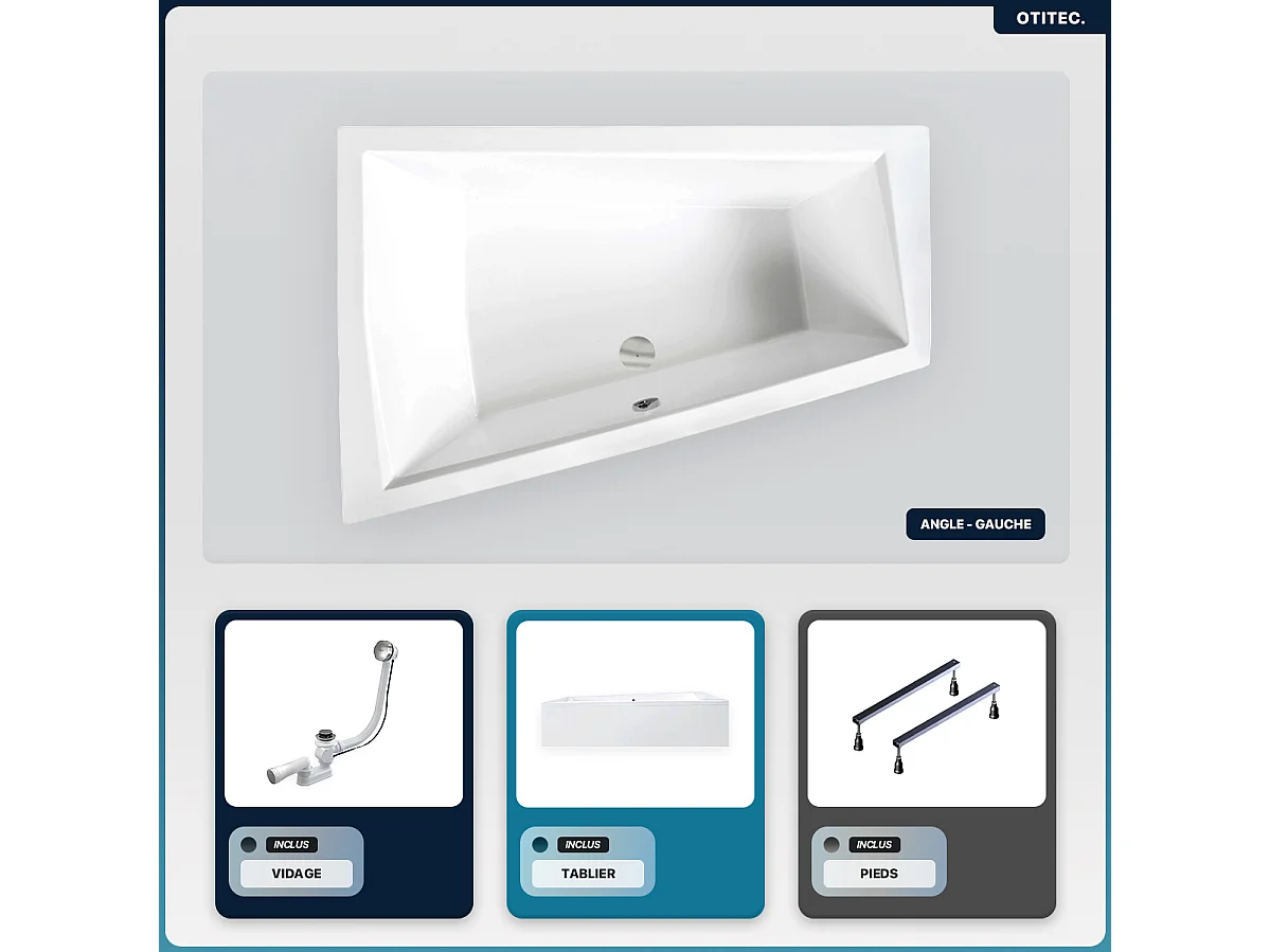 Baignoire asymétrique - 170 x 125 cm - Gauche - avec Tablier - Pieds - Vidage Chrome - INTIMA DUO