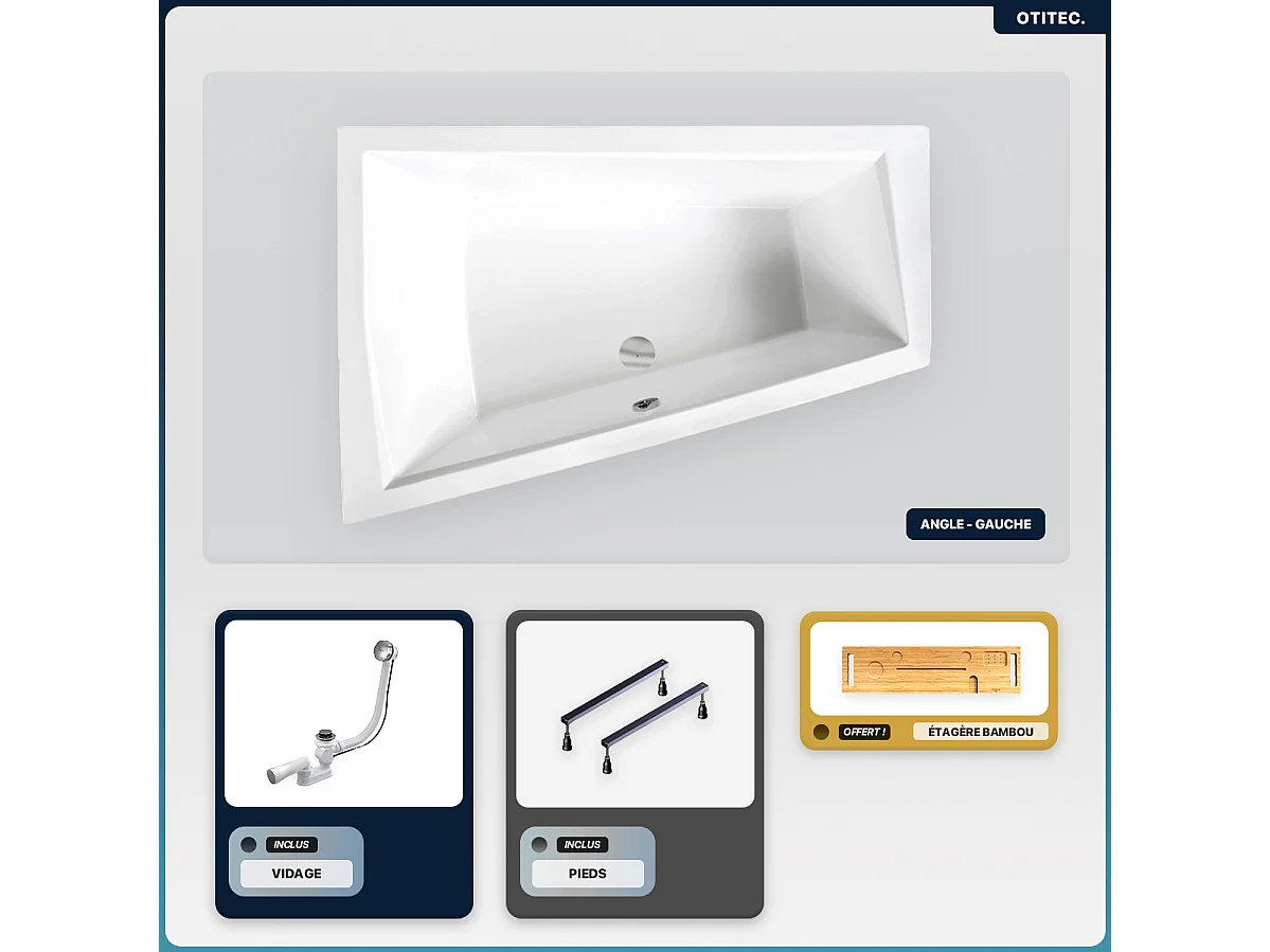 Baignoire asymétrique - 170 x 125 cm - Gauche - sans Habillage - avec Pieds - Étagère bambou - Vidage Chrome - INTIMA DUO