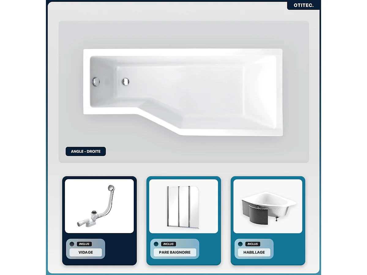 Baignoire asymétrique - 170 x 75 cm - Droite - avec Habillage - Pieds - Pare Baignoire 3 Volets - Vidage Chrome - INTEGRA