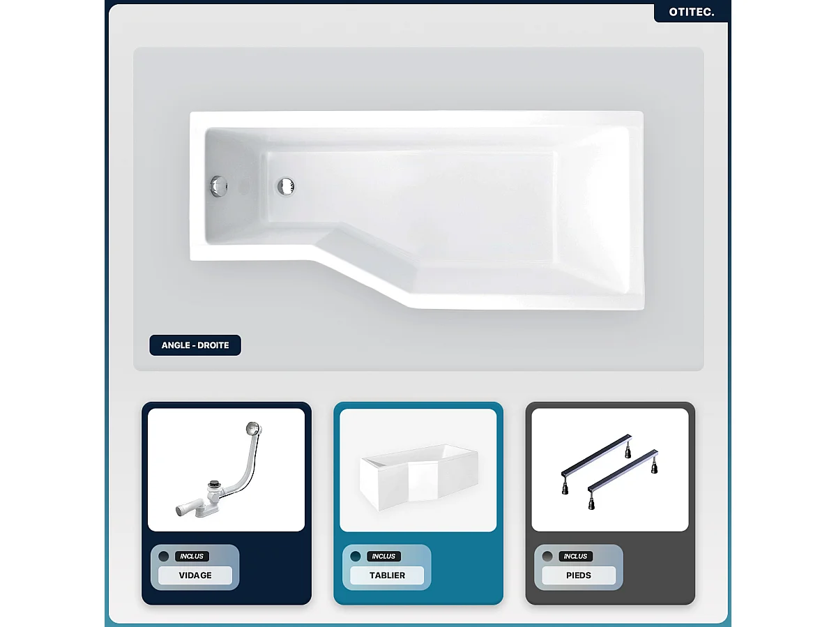 Baignoire asymétrique - 170 x 75 cm - Droite - avec Tablier - Pieds - Vidage Chrome - INTEGRA