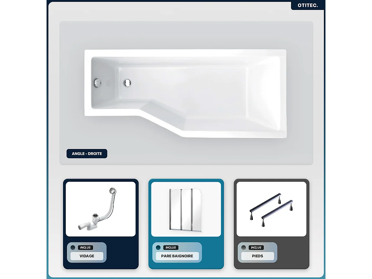 Baignoire asymétrique - 170 x 75 cm - Droite - sans Habillage - avec Pieds - Pare Baignoire 3 Volets - Vidage Chrome - INTEGRA