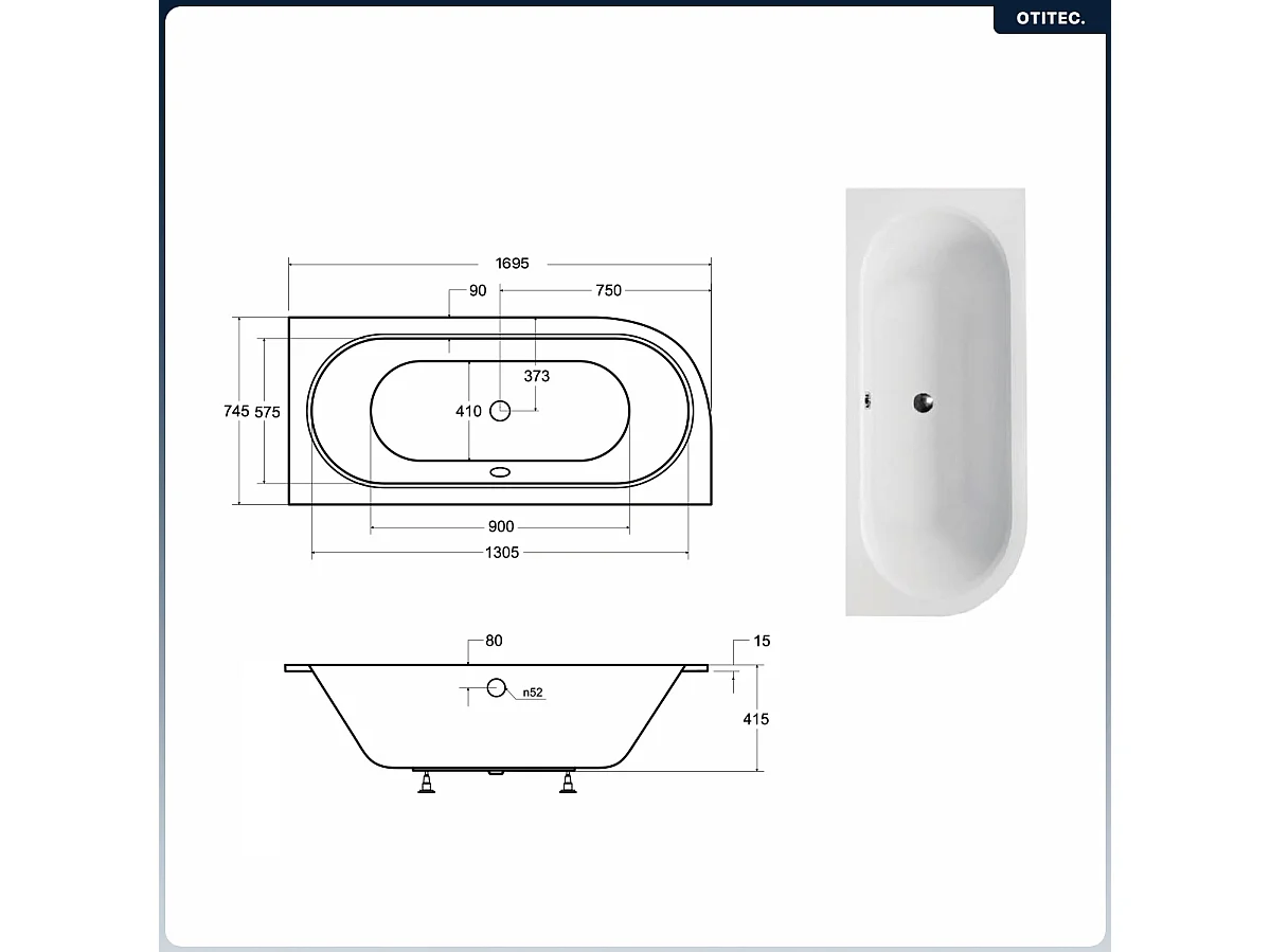 Baignoire asymétrique - 170 x 75 cm - Droite - sans Habillage - avec Pieds - Vidage Chrome - AVITA SLIM
