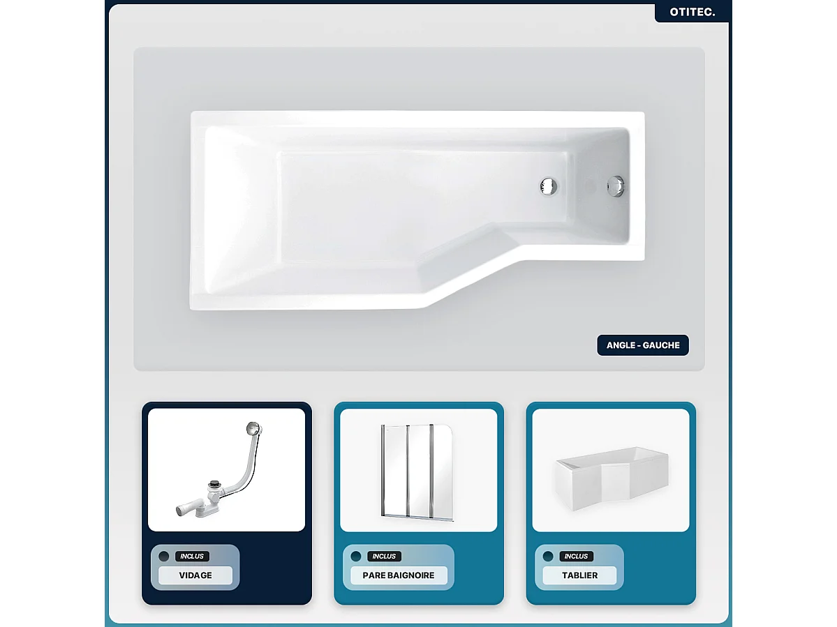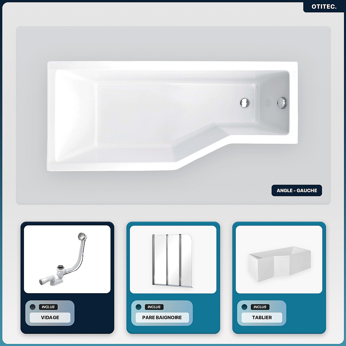 Baignoire asymétrique - 170 x 75 cm - Gauche - avec Tablier - Pieds - Pare Baignoire 3 Volets - Vidage Chrome - INTEGRA
