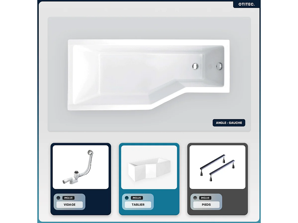 Baignoire asymétrique - 170 x 75 cm - Gauche - avec Tablier - Pieds - Vidage Chrome - INTEGRA