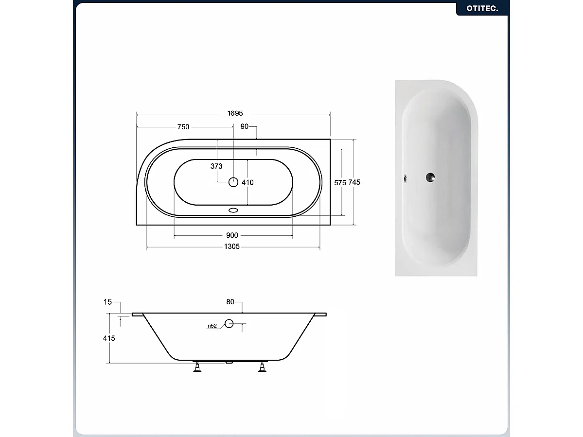 Baignoire asymétrique - 170 x 75 cm - Gauche - sans Habillage - avec Pieds - Vidage Chrome - AVITA SLIM