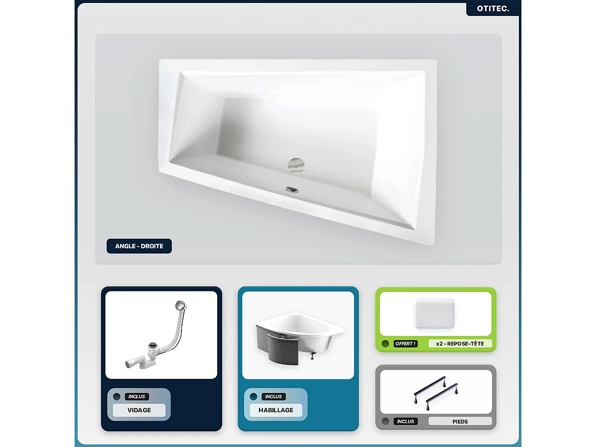 Baignoire asymétrique - 180 x 125 cm - Droite - avec Habillage - Pieds - 2 Repose-têtes - Vidage Chrome - INTIMA DUO