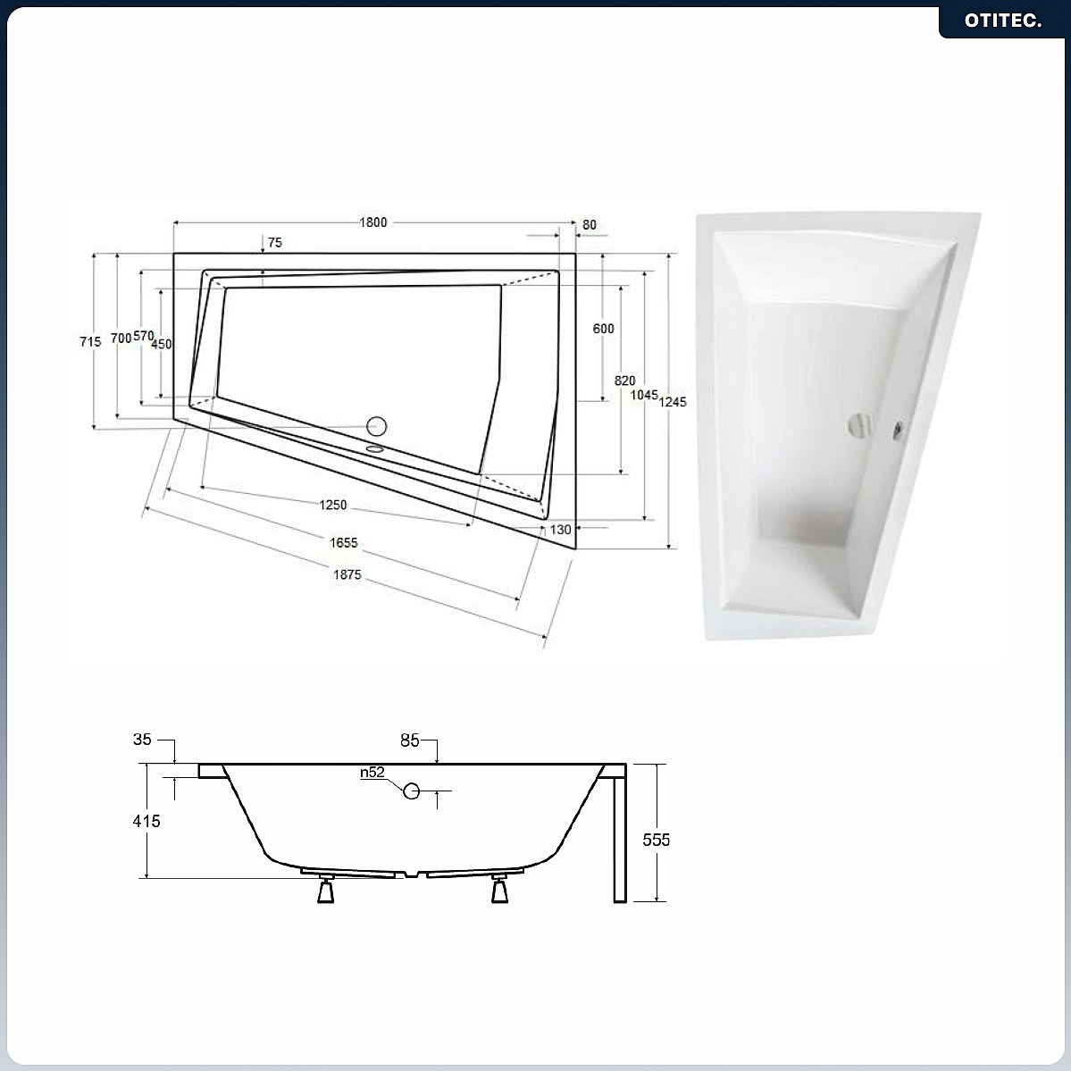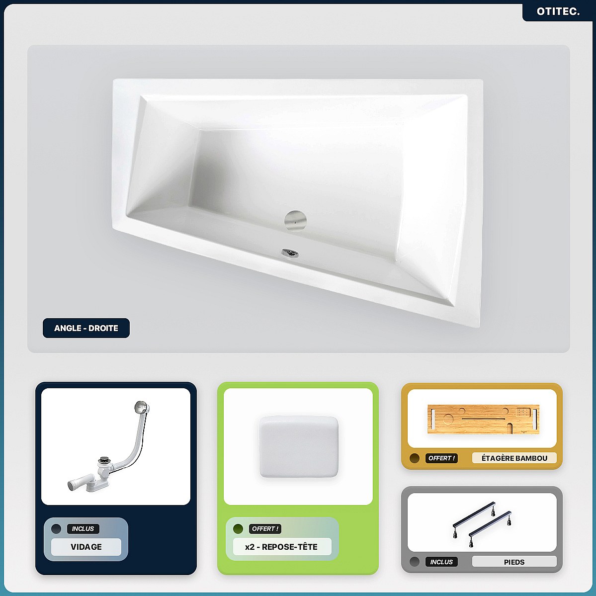 Baignoire asymétrique - 180 x 125 cm - Droite - sans Habillage - avec Pieds - 2 Repose-têtes - Étagère bambou - Vidage Chrome - INTIMA DUO