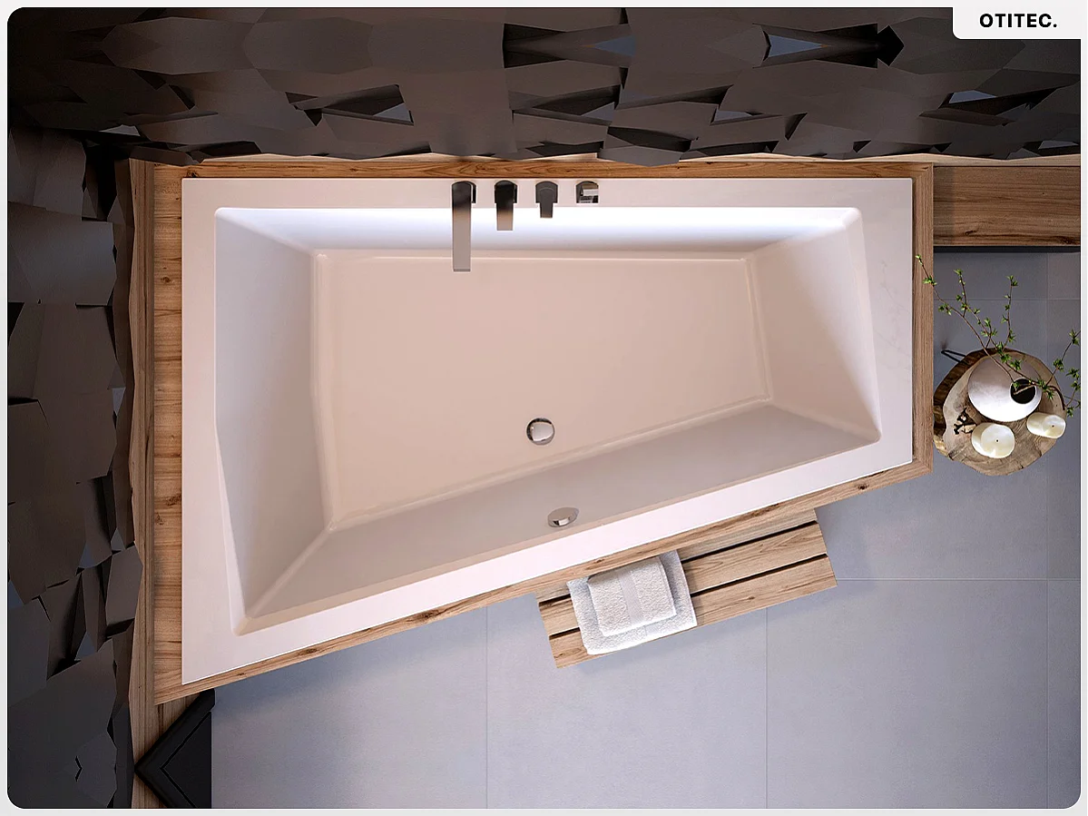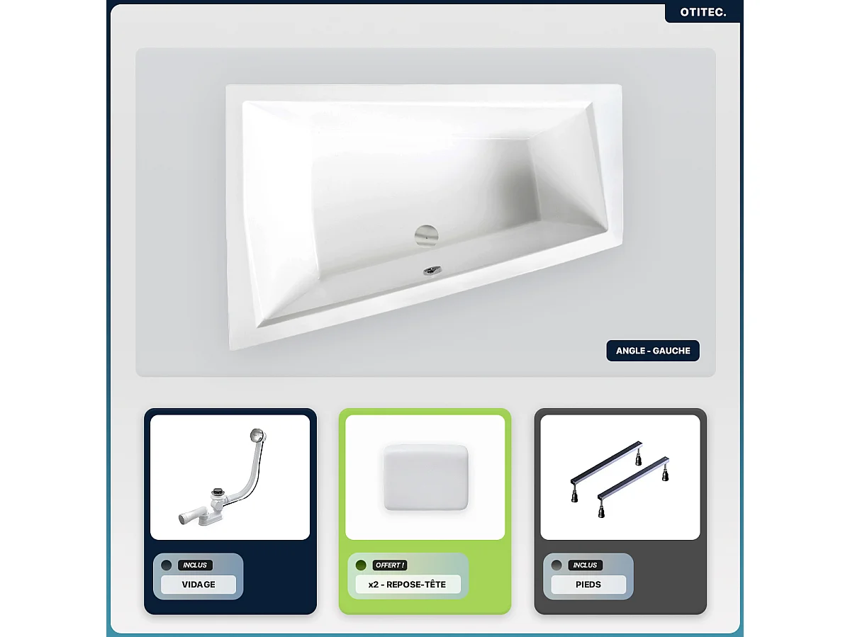 Baignoire asymétrique - 180 x 125 cm - Gauche - sans Habillage - avec Pieds - 2 Repose-têtes - Vidage Chrome - INTIMA SLIM