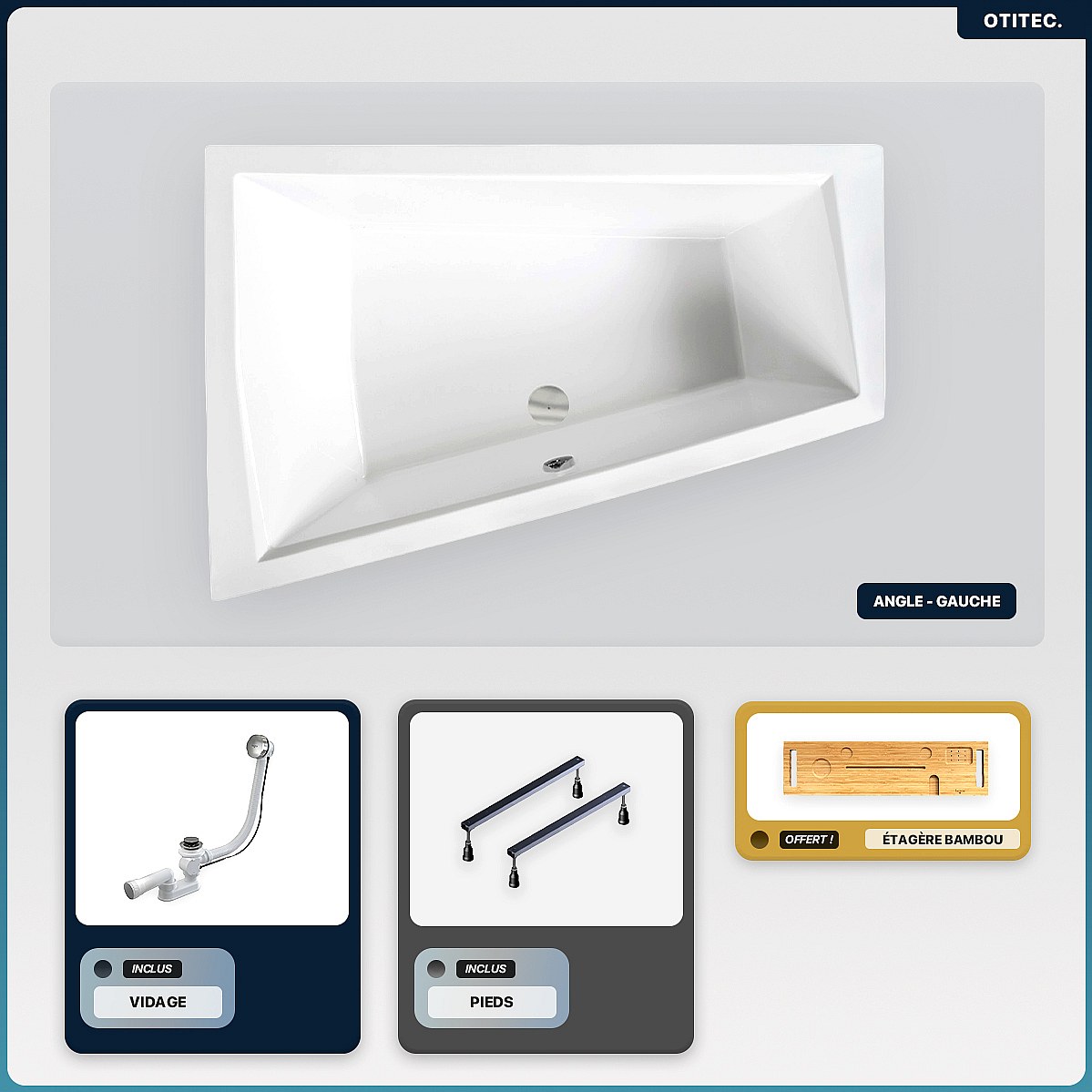 Baignoire asymétrique - 180 x 125 cm - Gauche - sans Habillage - avec Pieds - Étagère bambou - Vidage Chrome - INTIMA DUO