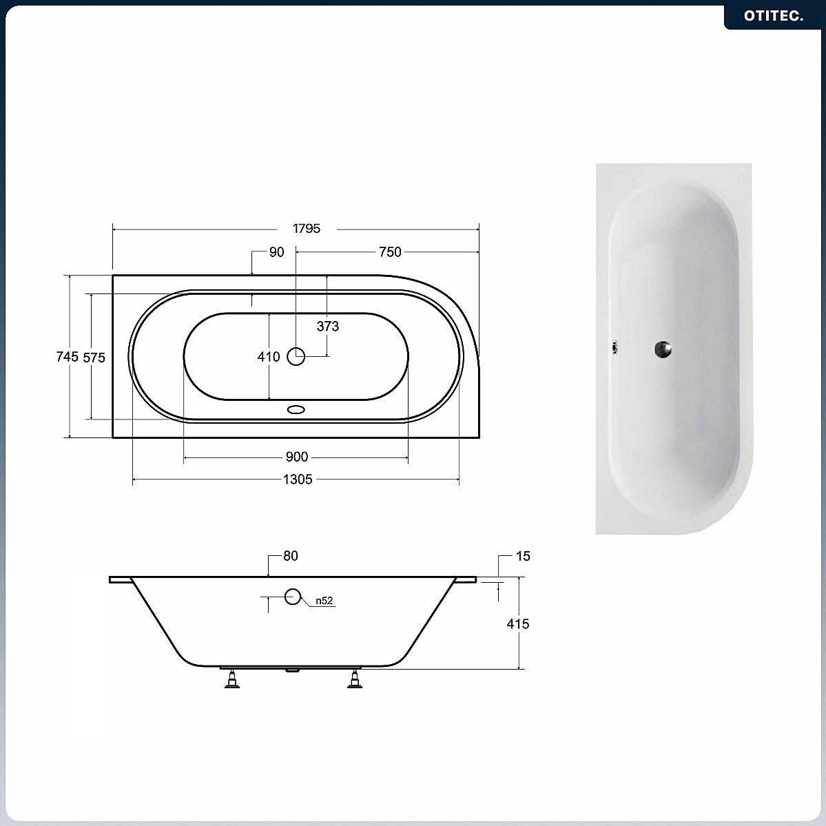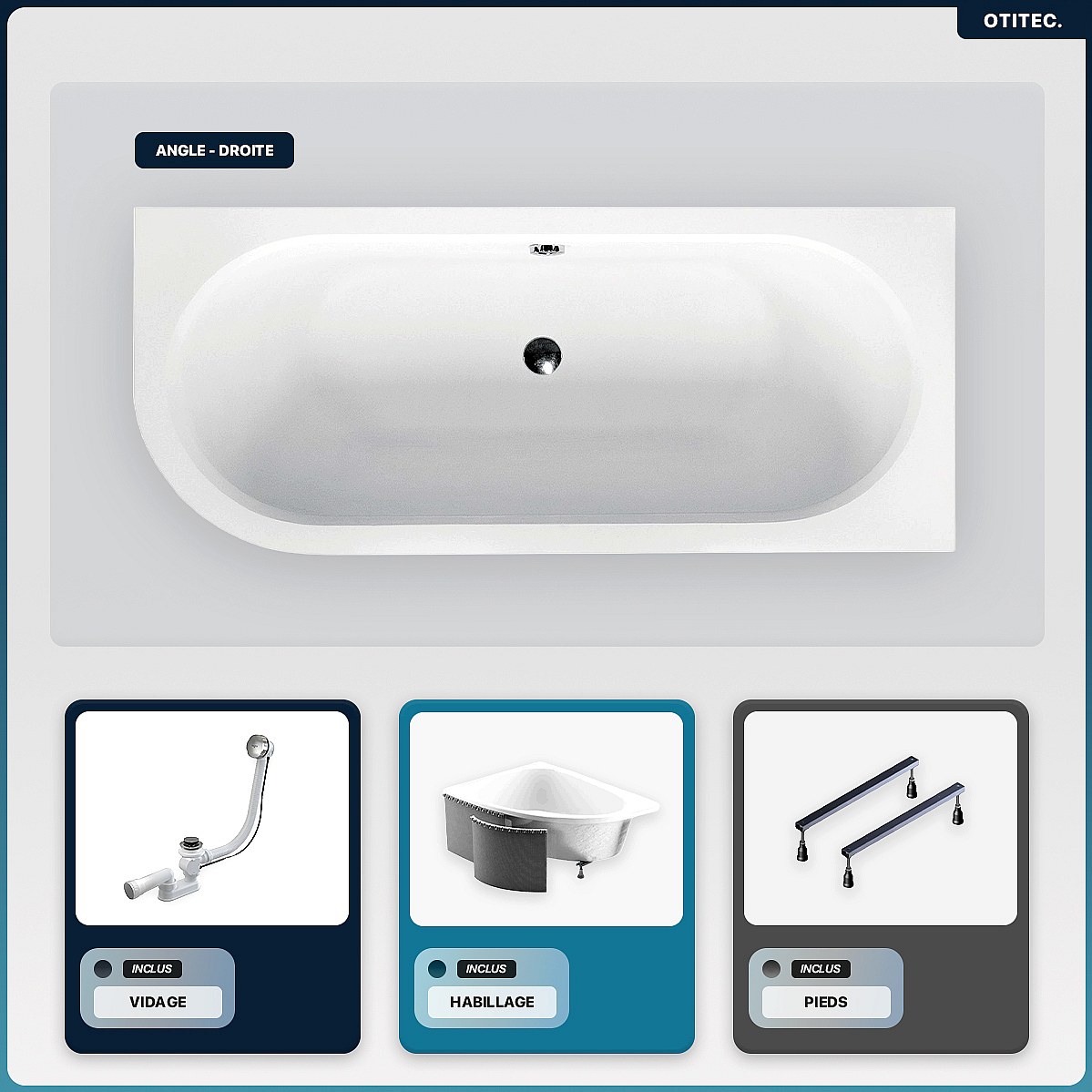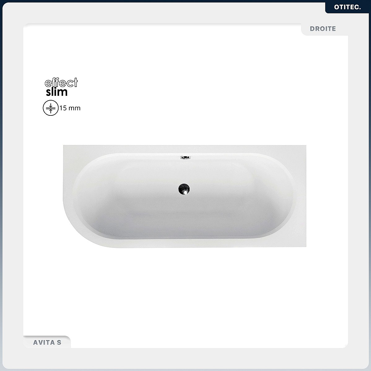 Baignoire asymétrique - 180 x 80 cm - Droite - avec Habillage - Pieds - Vidage Chrome - AVITA SLIM