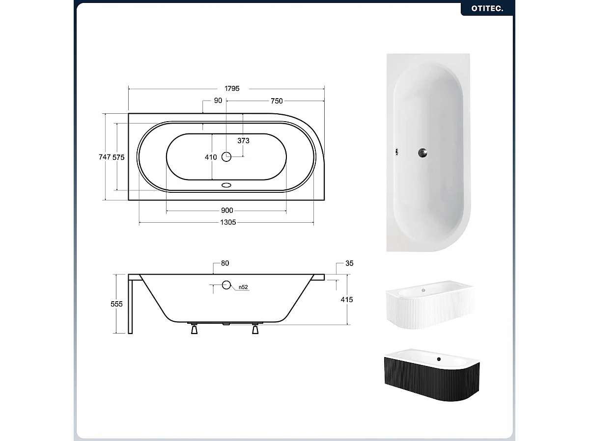 Baignoire asymétrique - 180 x 80 cm - Droite - avec Tablier Rainuré - Siphon Chrome & Pieds - INCLUS - AVITA WHITE