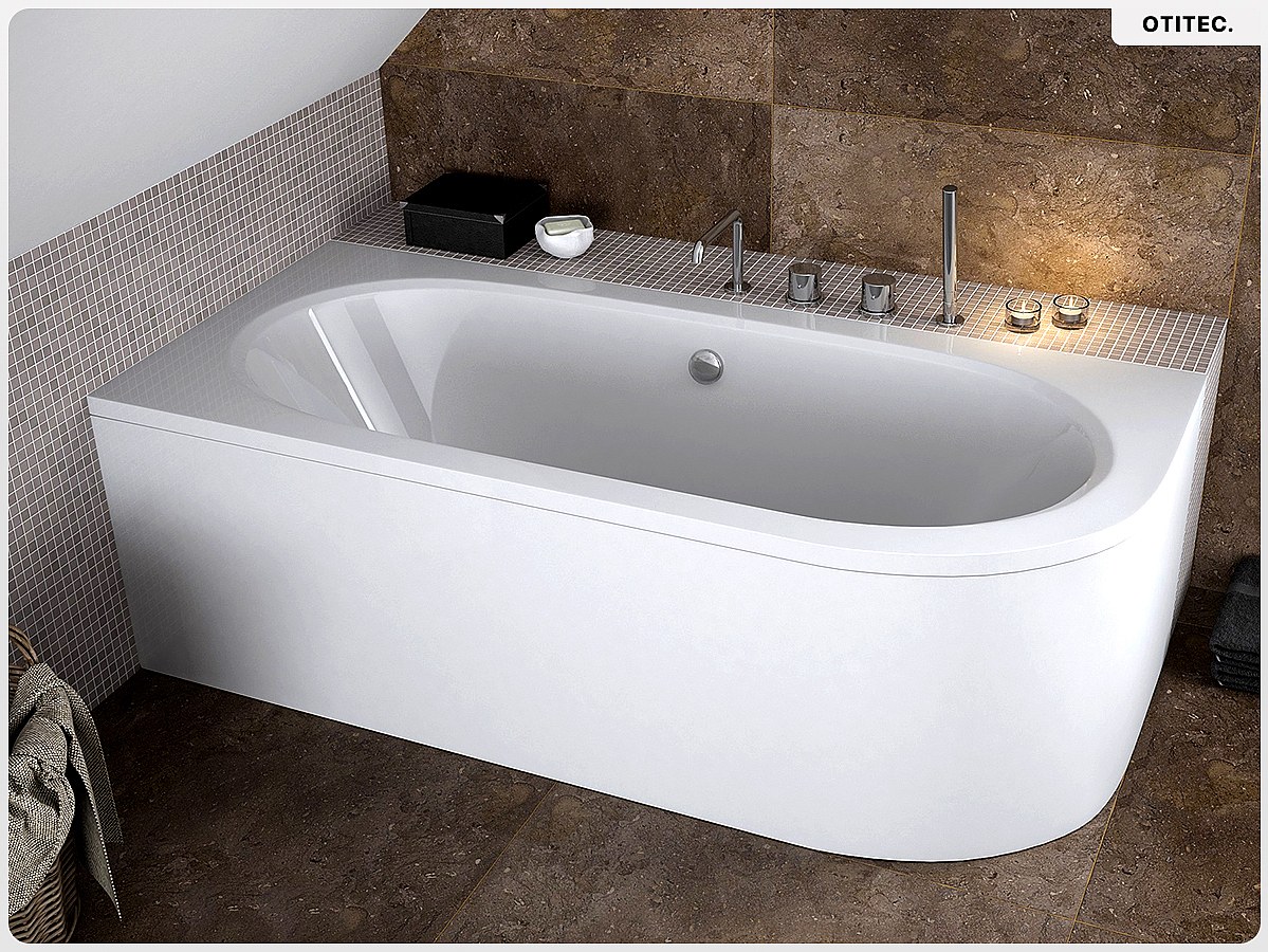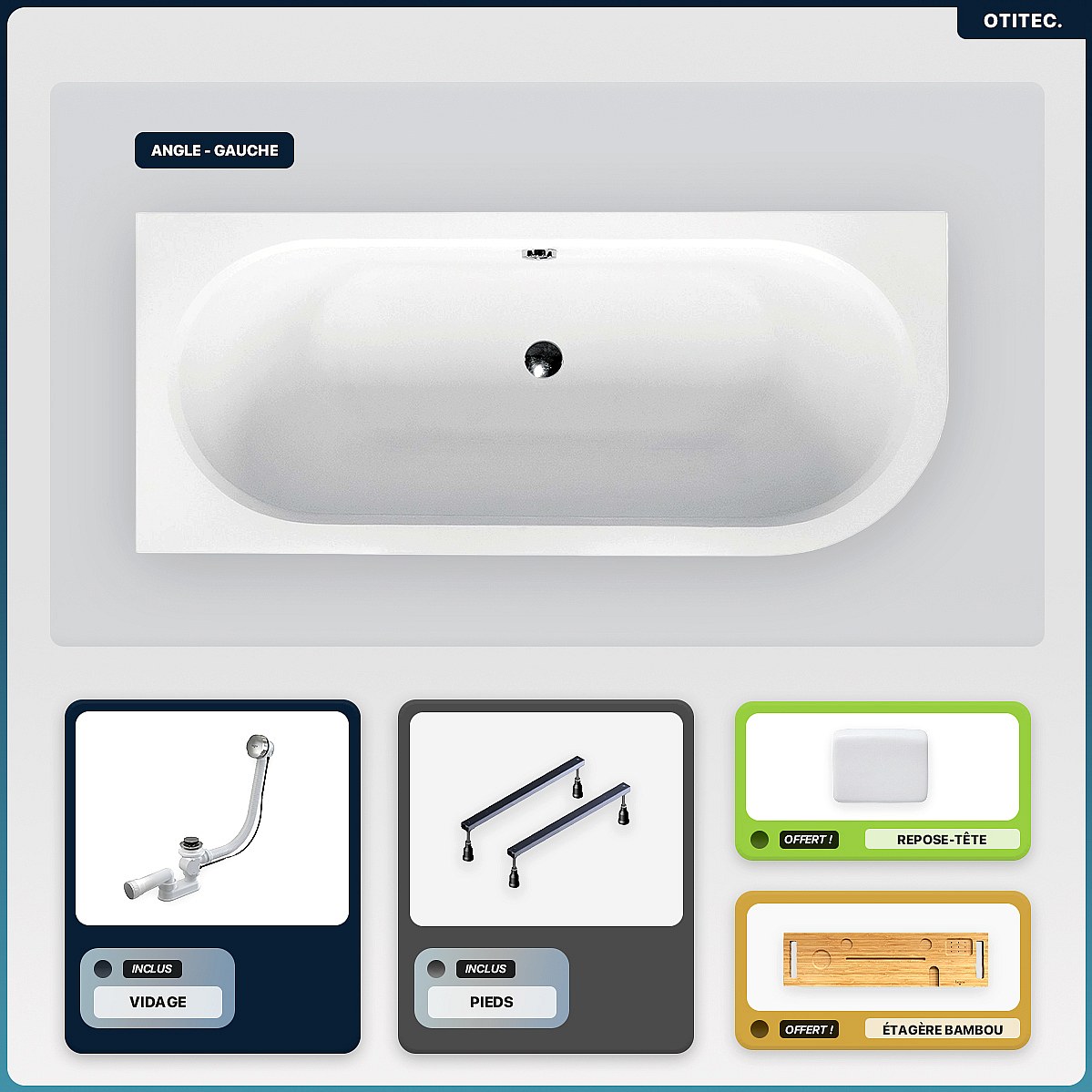Baignoire asymétrique - 180 x 80 cm - Gauche - sans Habillage - avec Pieds - Repose-tête - Étagère bambou - Vidage Chrome - AVITA