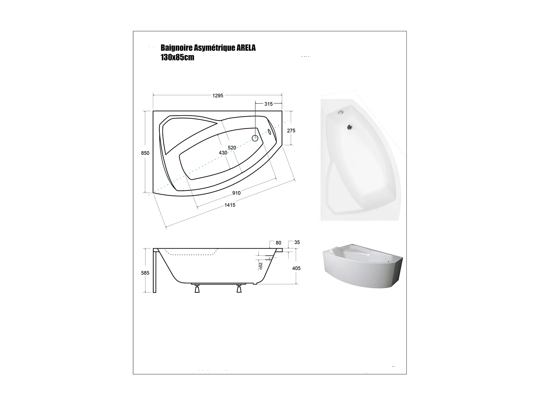 Baignoire Asymétrique avec Tablier - 130 x 85 cm - ARELA - GAUCHE - avec Repose Tête OFFERT