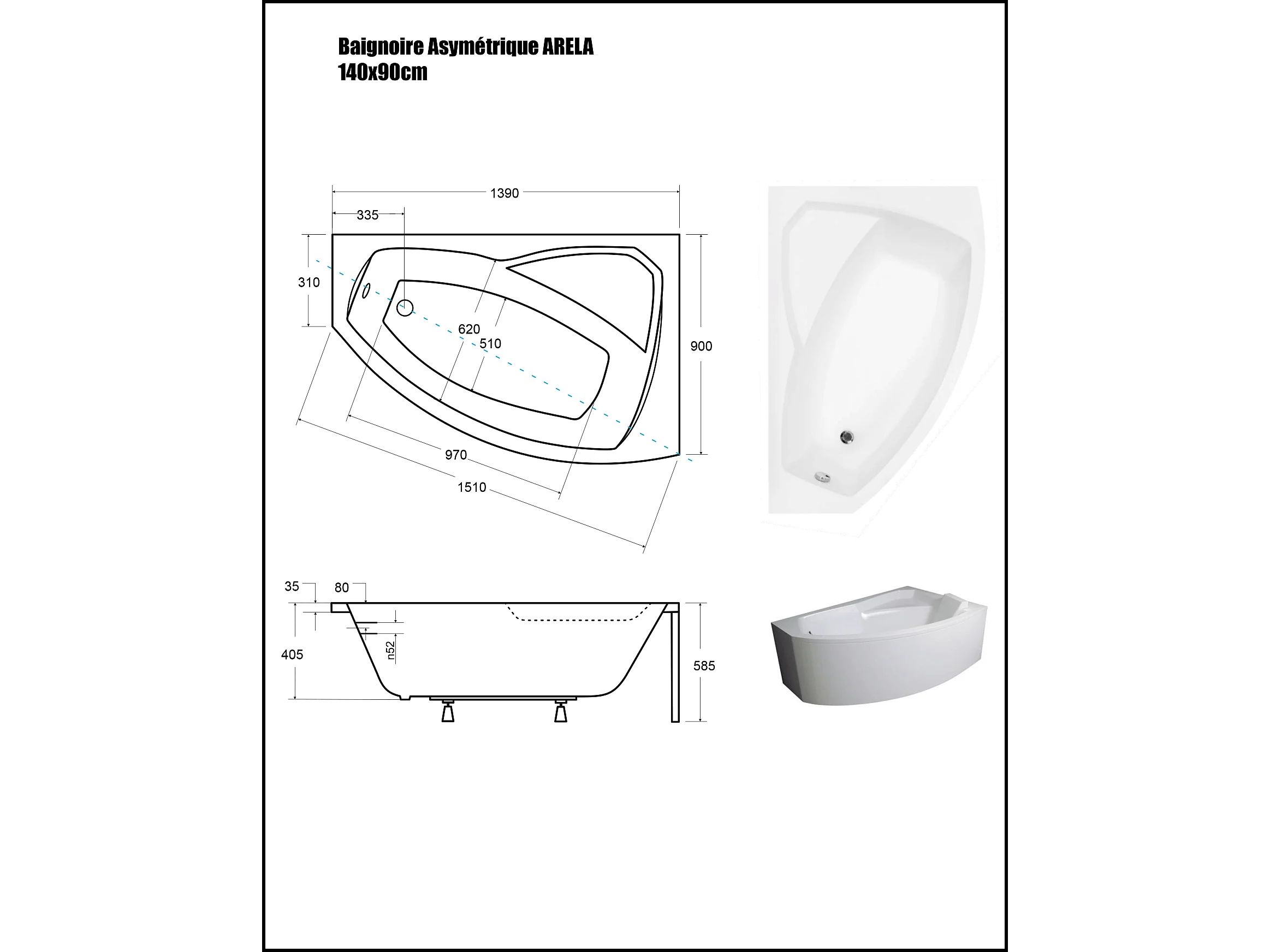 Baignoire Asymétrique avec Tablier - 140 x 90 cm - ARELA - DROITE - avec Repose Tête OFFERT