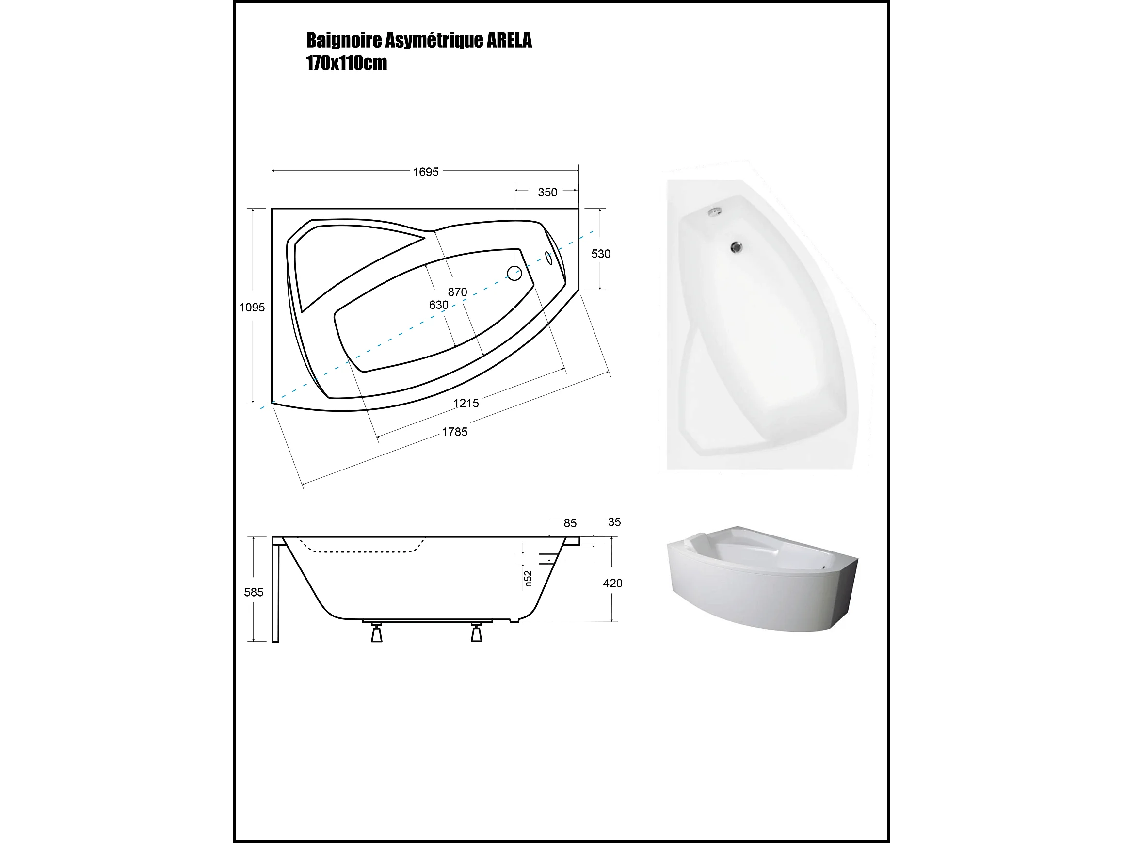 Baignoire Asymétrique avec Tablier - 170 x 110 cm - ARELA - GAUCHE - avec Repose Tête OFFERT