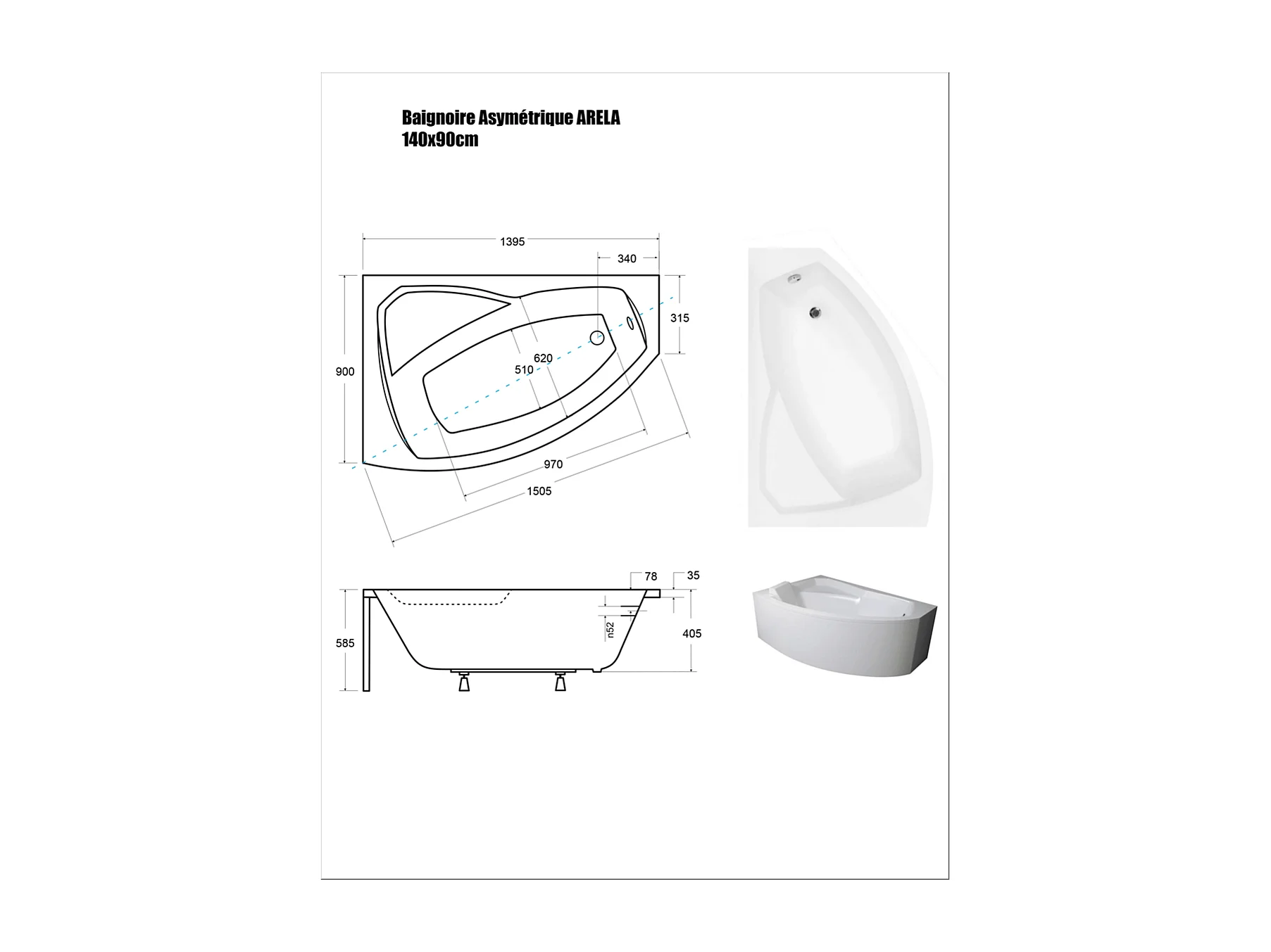 Baignoire Asymétrique avec Tablier Noir - 140 x 90 cm - ARELA - GAUCHE - avec Repose Tête OFFERT