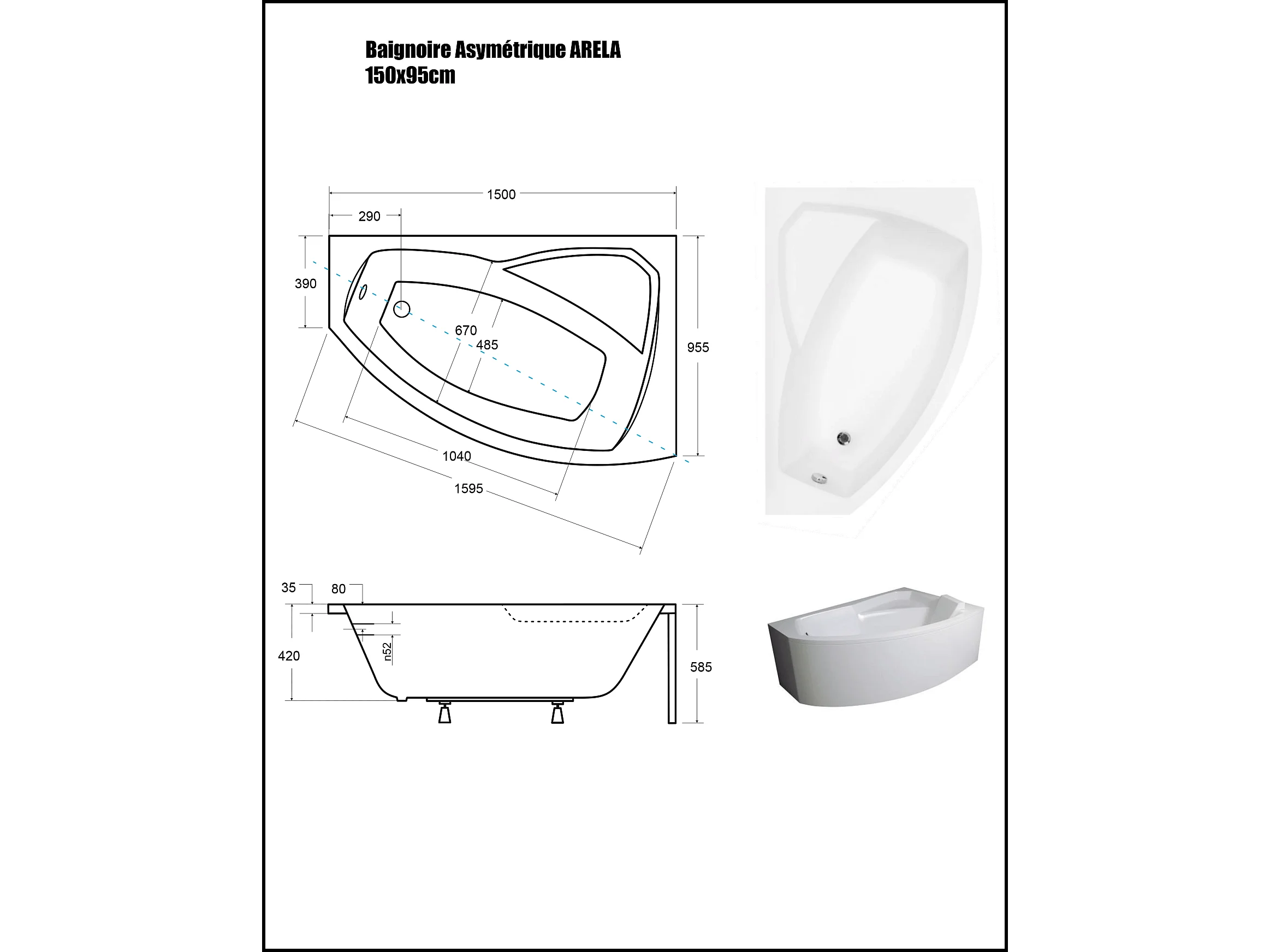 Baignoire Asymétrique avec Tablier Noir - 150 x 95 cm - ARELA - DROITE - avec Repose Tête OFFERT