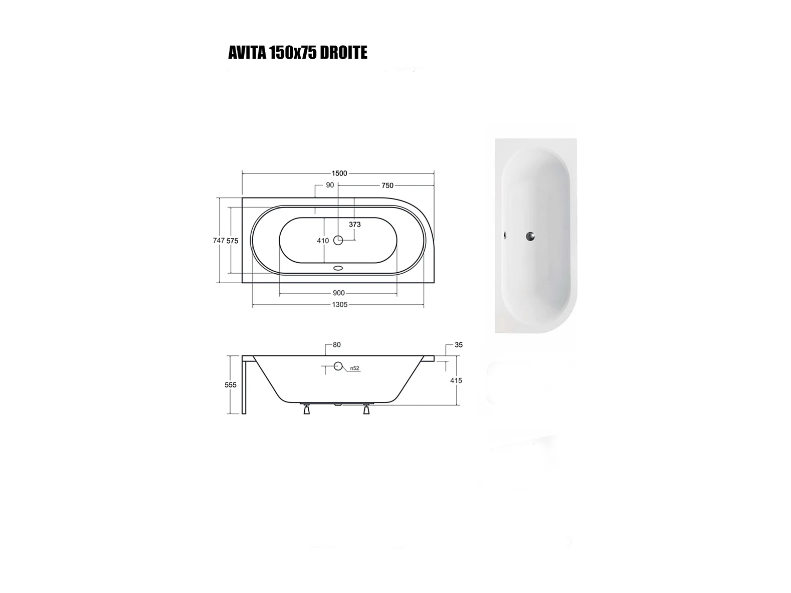 Baignoire Asymétrique sans Tablier - 150 x 75 cm - AVITA SANS TABLIER - DROITE - 1 REPOSE-TÊTE OFFERT