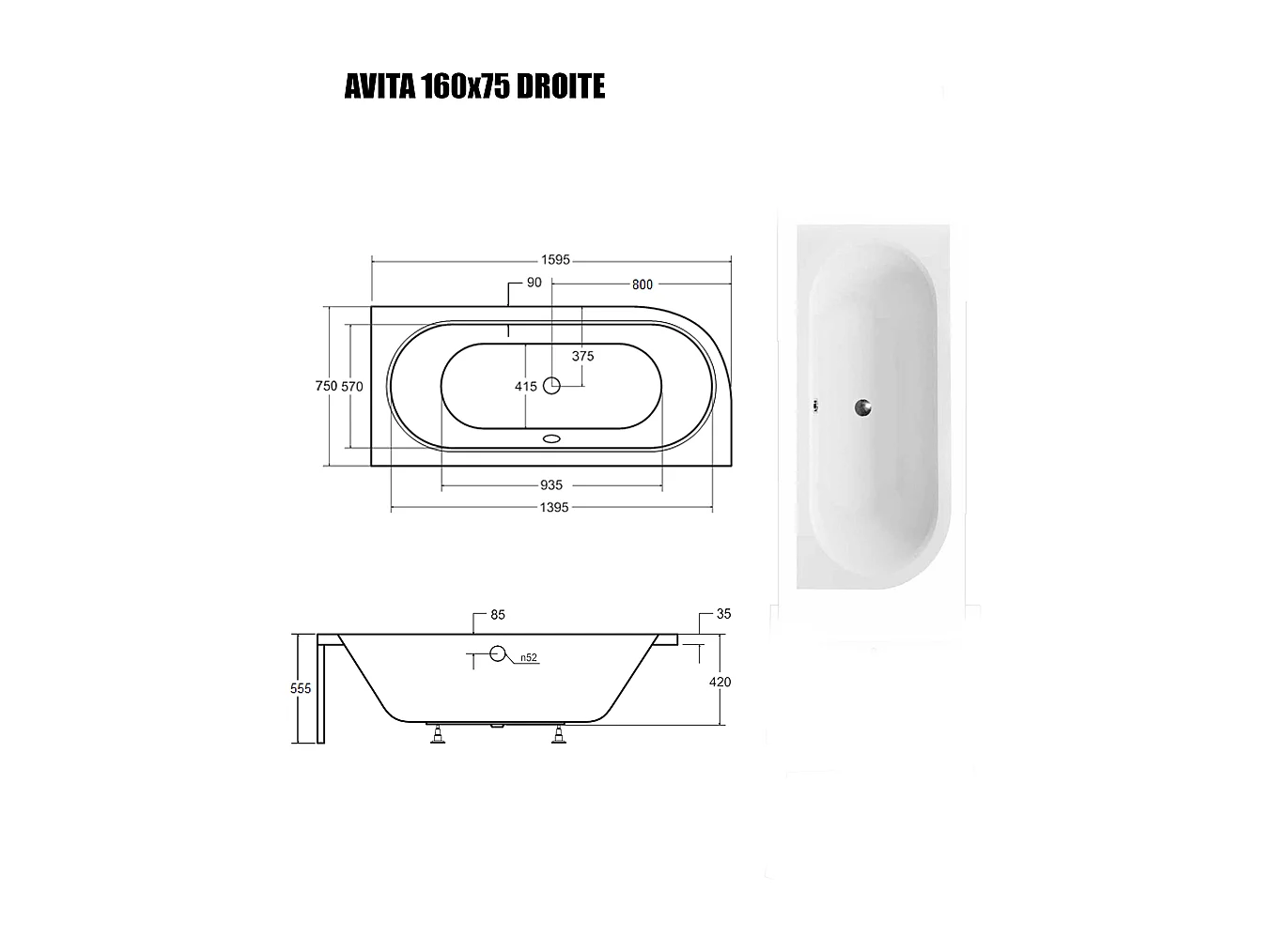 Baignoire Asymétrique sans Tablier - 160 x 75 cm - AVITA SANS TABLIER - DROITE - 1 REPOSE-TÊTE OFFERT