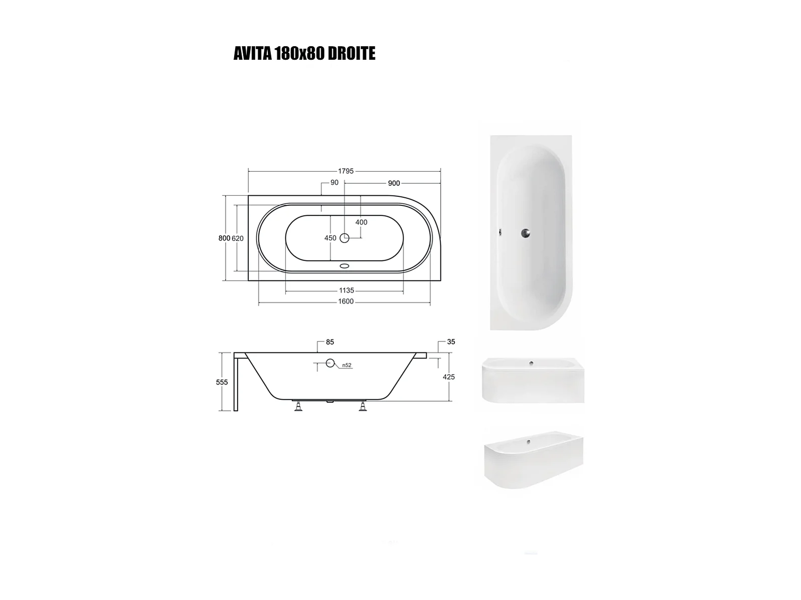 Baignoire Asymétrique sans Tablier - 180 x 80 cm - AVITA SANS TABLIER - DROITE - 1 REPOSE-TÊTE OFFERT