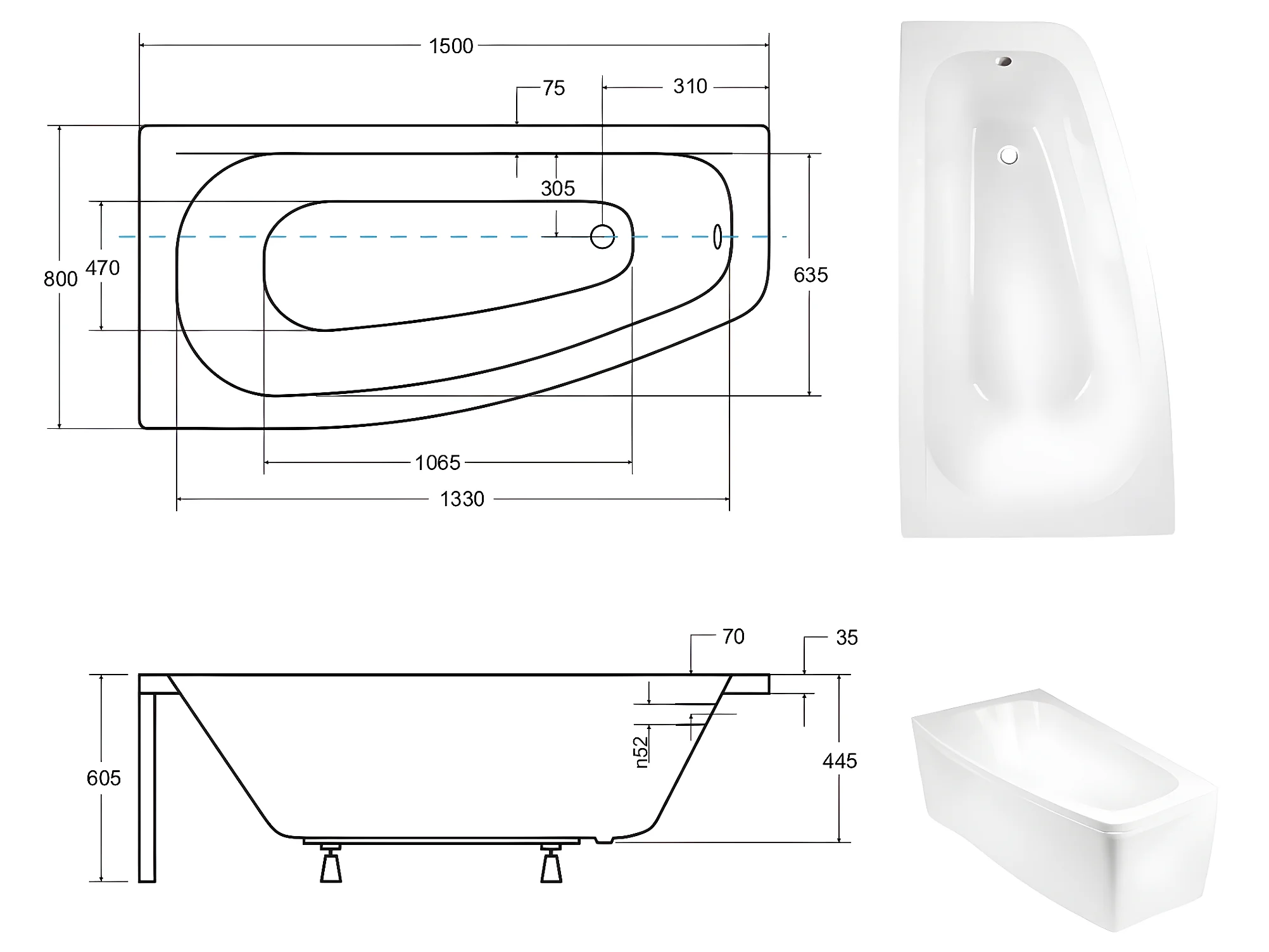 Baignoire asymétrique + tablier blanc + repose tête - LUNA - 150 x 80 cm - Gauche