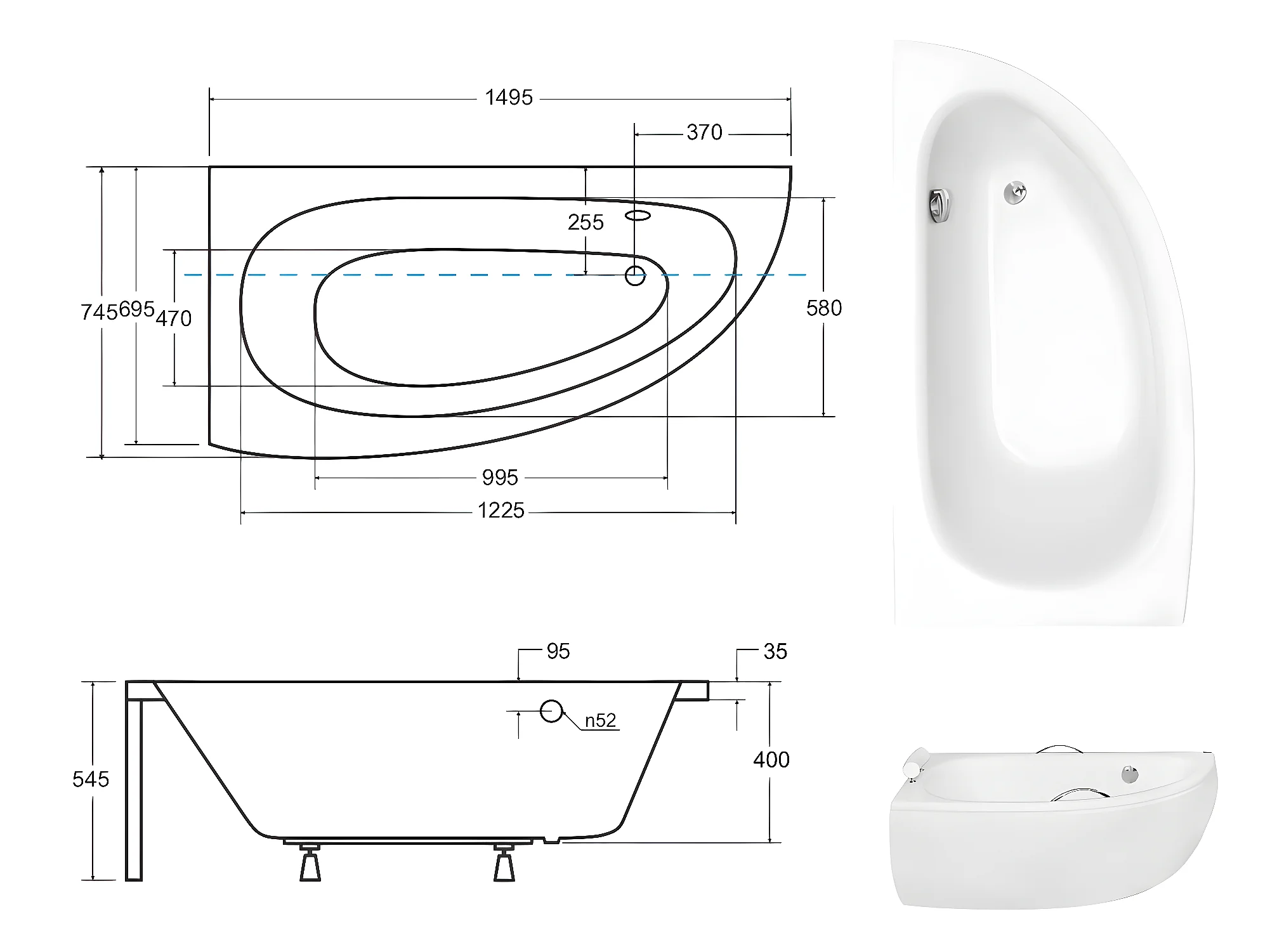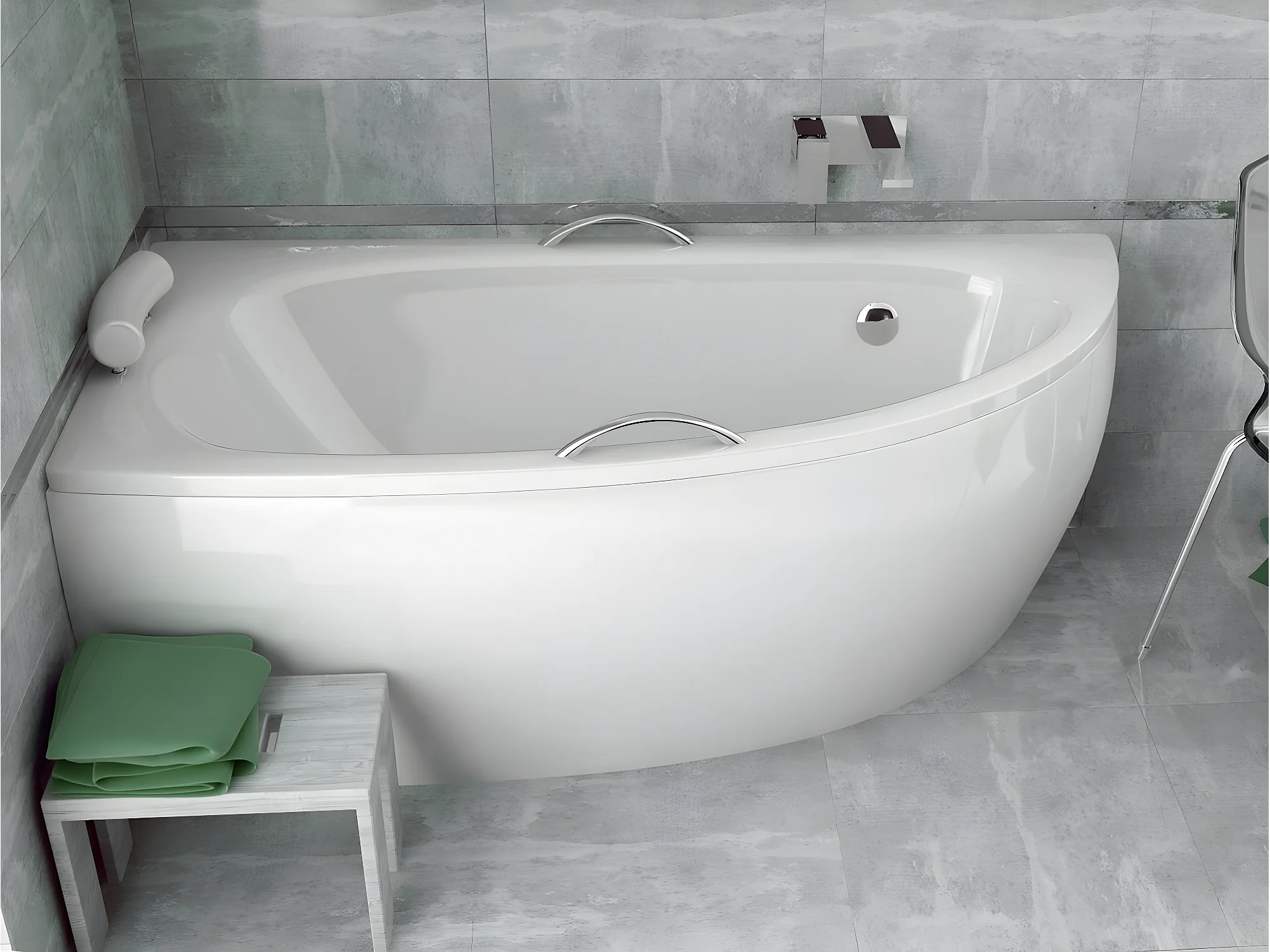 Baignoire asymétrique + tablier blanc + repose tête + poignées - MILENA PREMIUM - 150 x 70 cm - Gauche