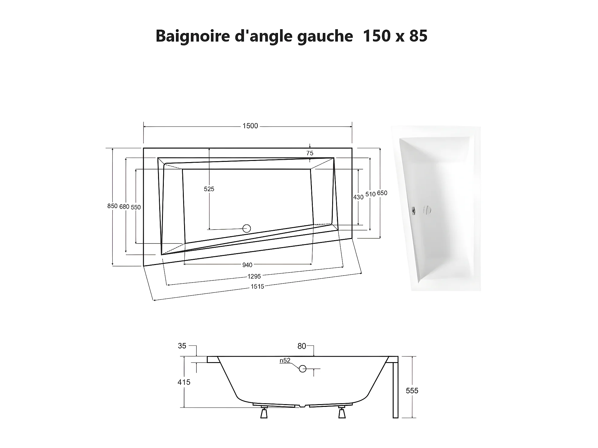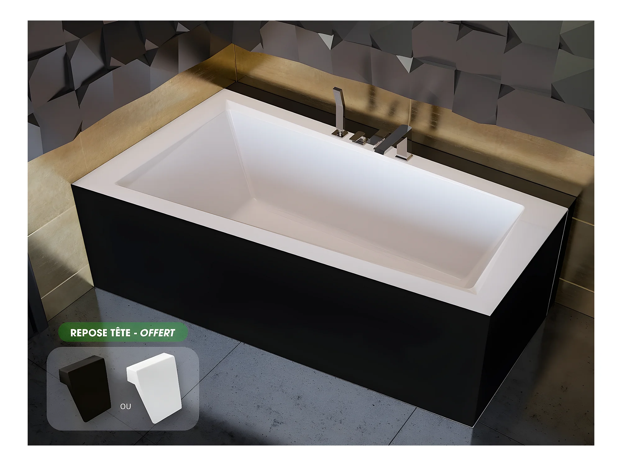 Baignoire asymétrique + tablier noir + repose tête - INTIMA - 150 x 85 cm - Gauche