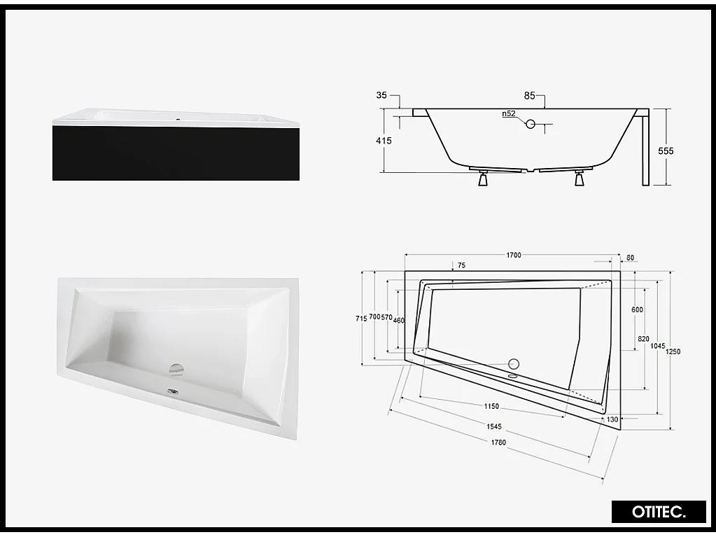 Baignoire Asymétrique avec Tablier Noir - 170 x 125 cm - DROITE - INTIMA DUO - 2 REPOSE-TÊTES OFFERTS