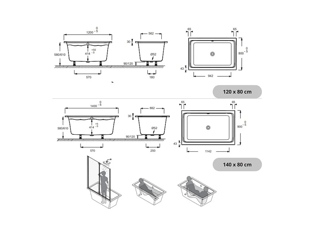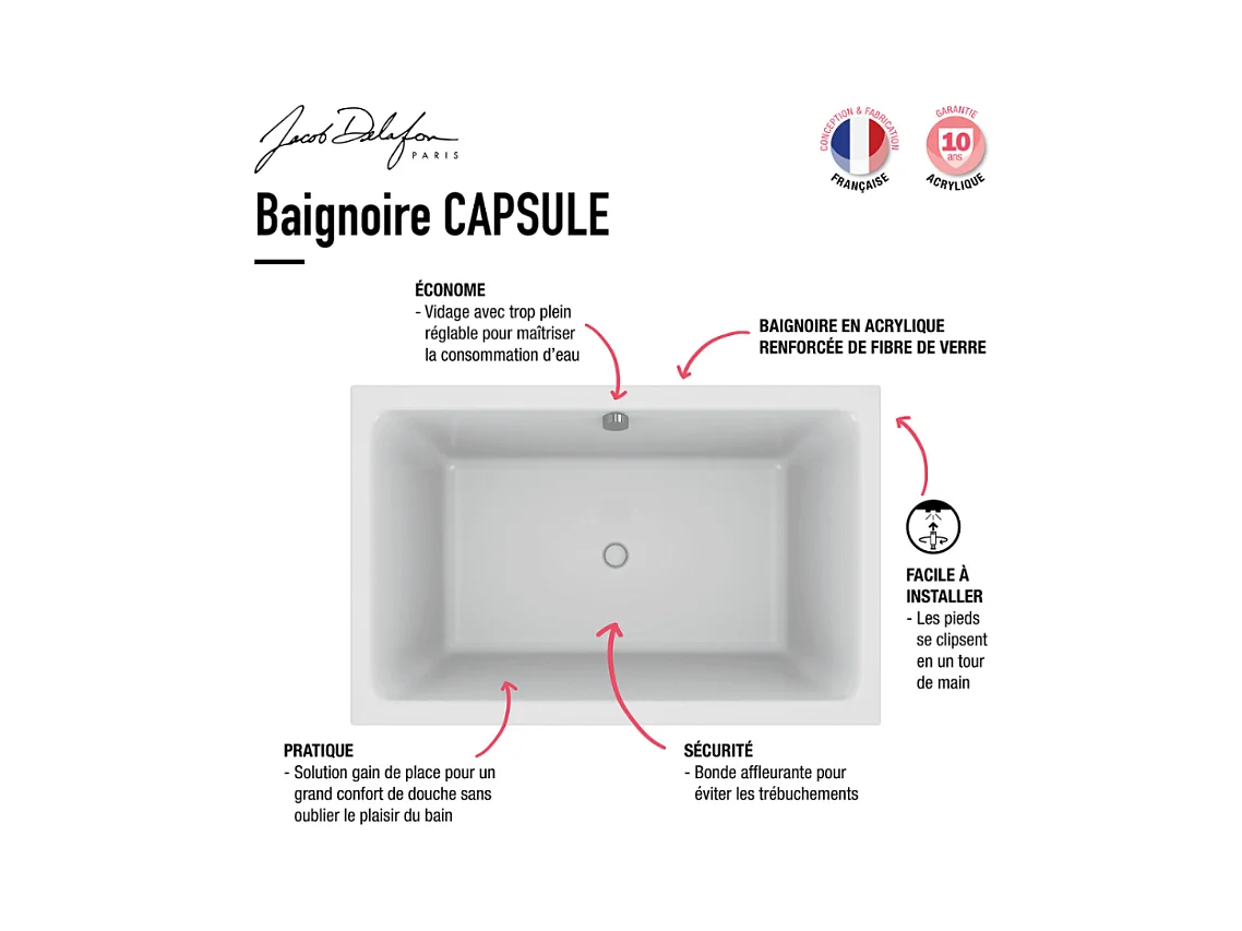 Baignoire bain douche JACOB DELAFON Capsule, compacte + pare bain en niche 120 x 80 cm