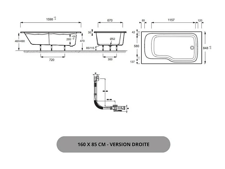 Baignoire bain douche JACOB DELAFON Malice 160 x 85 cm version Droite, Blanc mat