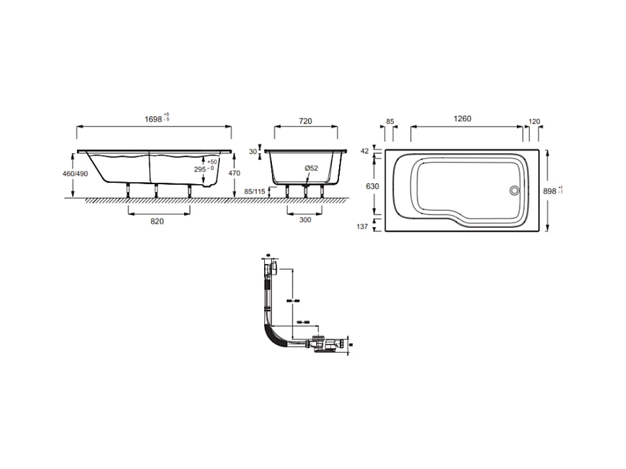 Baignoire bain douche JACOB DELAFON Malice antidérapante + tablier angle + pare bain 170 x 90, droite