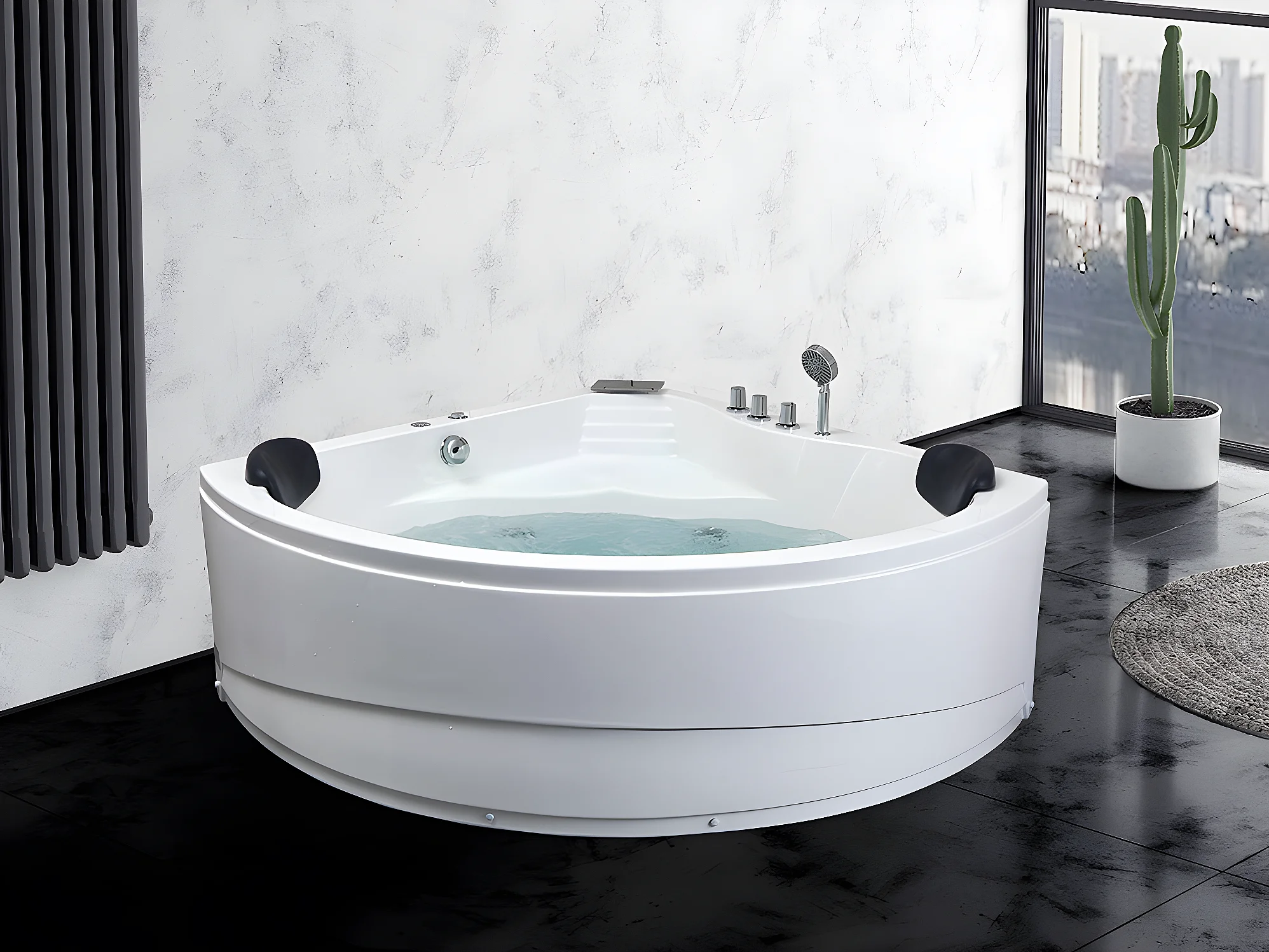 Baignoire balnéo d'angle avec système de cascade AGLENA - 2 places - 350L - 150*150*60 cm
