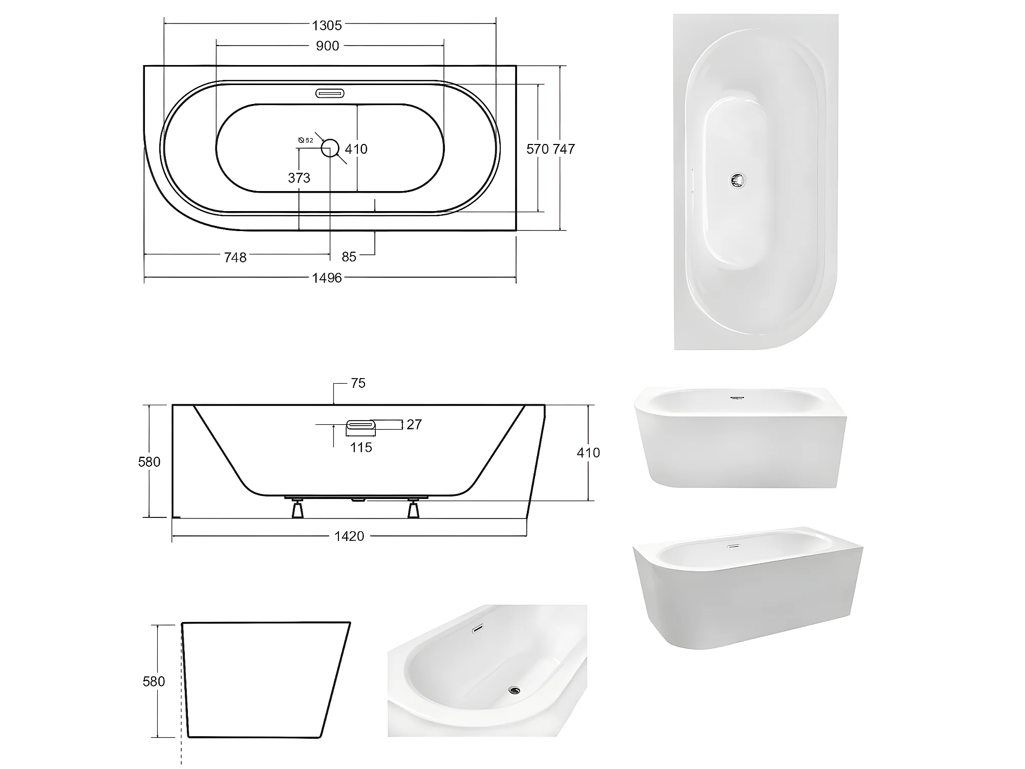 Baignoire d'angle Blanc + Siphon Graphite et Vidage inclus + Repose tête - AVITA S CLASSE - DROITE - 150 x 75 cm