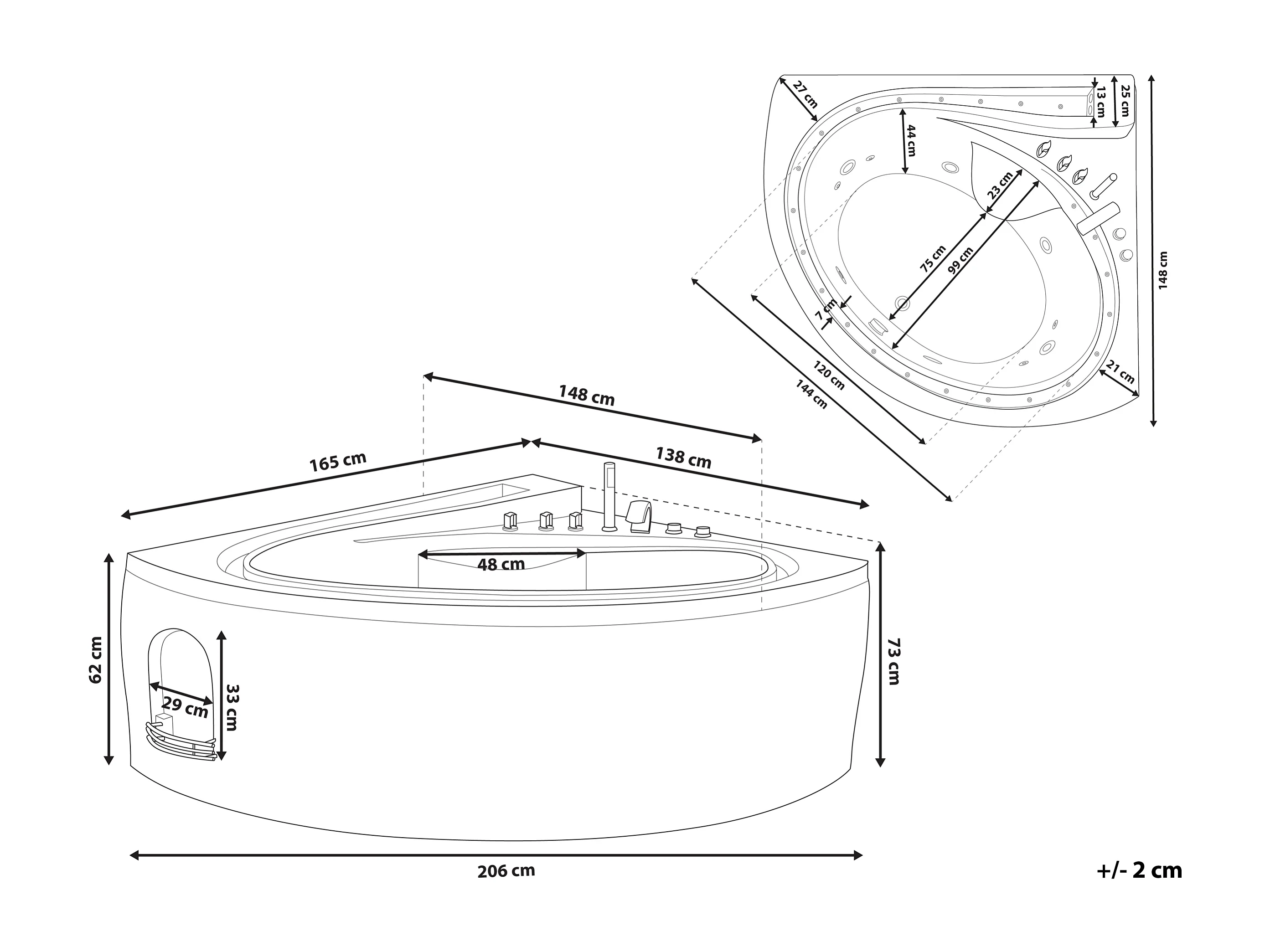 Baignoire d\'angle à remous avec LED PELICAN 206 x 165 cm Blanc