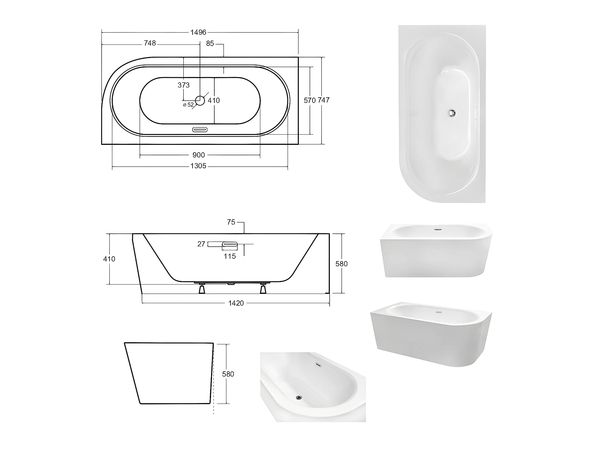 Baignoire d'angle Noir et Blanc + Siphon Graphite et Vidage inclus + Repose tête - AVITA S CLASSE - GAUCHE - 150 x 75 cm