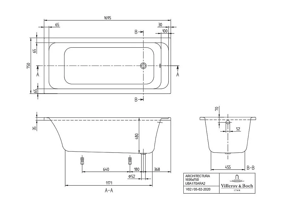 Baignoire droite 170 X 75 VILLEROY ET BOCH Architectura acrylique avec pieds