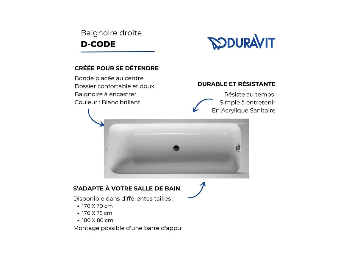 Baignoire droite 170x75 DURAVIT D-Code bonde au centre