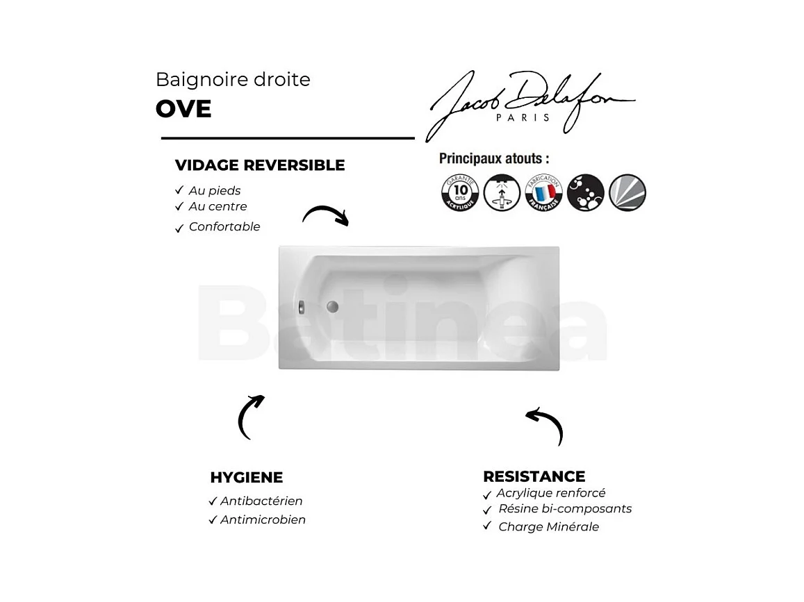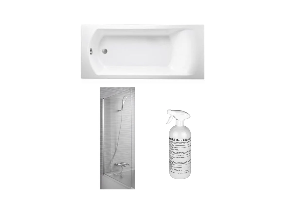 Baignoire droite JACOB DELAFON Ove 170 x 70 cm, bonde excentré + pare bain chrome + nettoyant