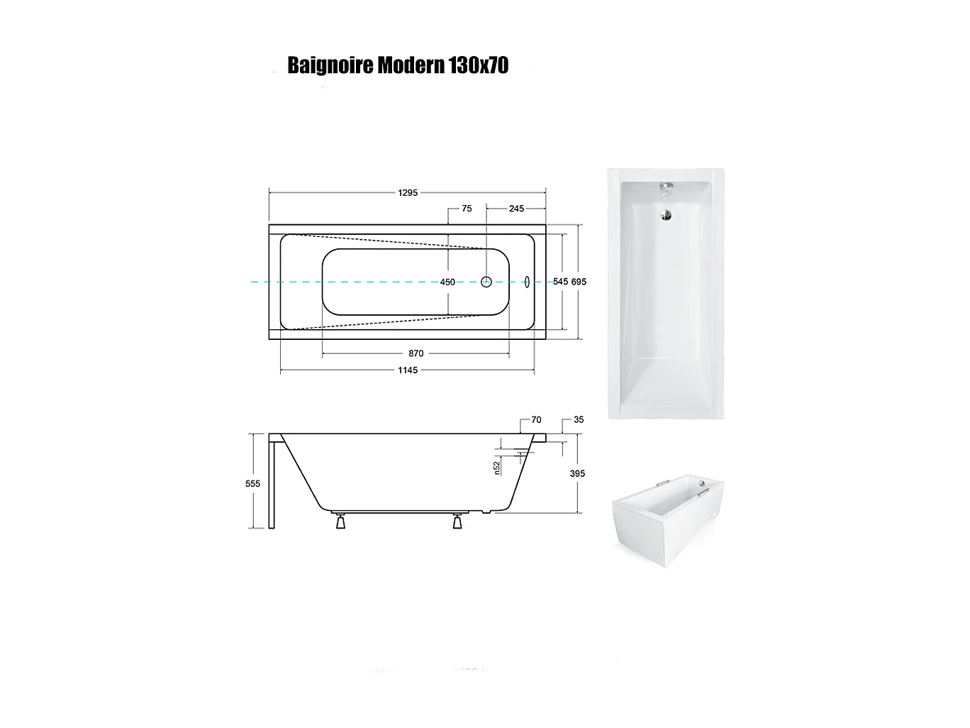 Baignoire Droite sans Tablier - 130 x 70 cm - MODERN SANS TABLIER - REPOSE-TÊTE OFFERT