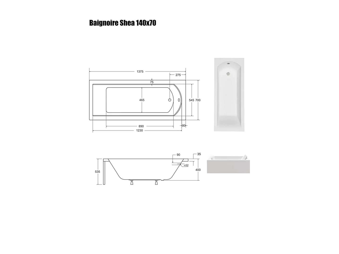Baignoire Droite sans Tablier - 140 x 70 cm - SHEA SANS TABLIER - REPOSE-TÊTE OFFERT