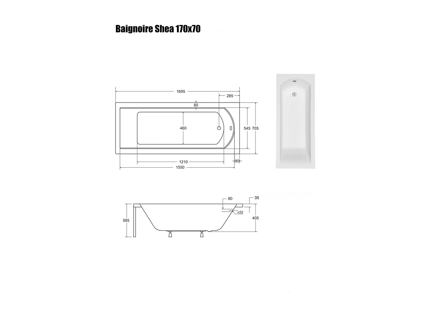 Baignoire Droite sans Tablier - 170 x 70 cm - SHEA SANS TABLIER - REPOSE-TÊTE OFFERT
