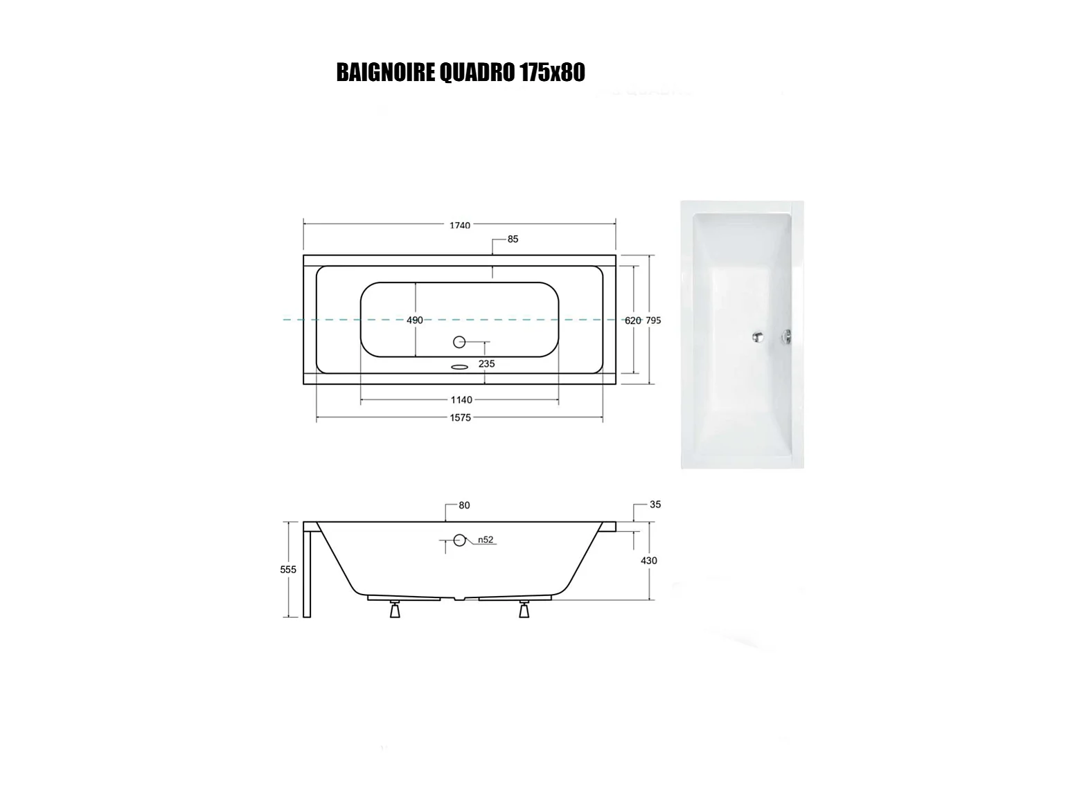 Baignoire Droite sans Tablier - 175 x 80 cm - QUADRO SANS TABLIER - REPOSE-TÊTE OFFERT