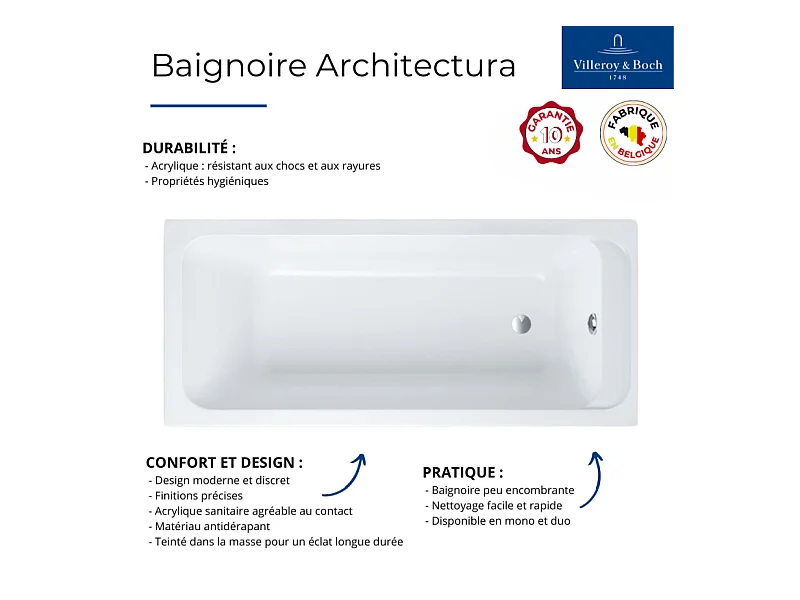 Baignoire droite VILLEROY & BOCH Architectura acrylique 150 x 70 cm + Pare bain droite AURYS Raywall chromé