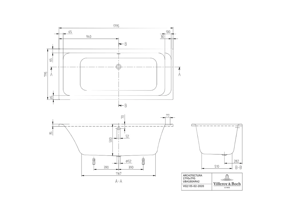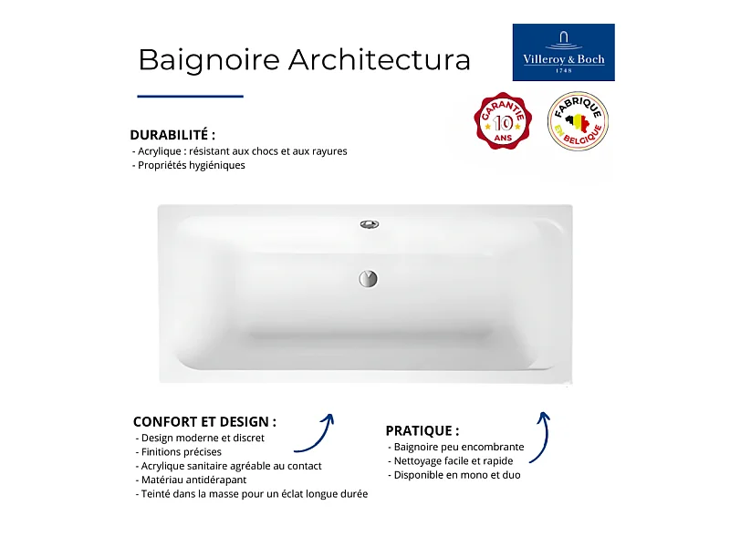 Baignoire droite VILLEROY & BOCH Architectura acrylique 180 x 80 cm + Pare bain droite AURYS Raywall chromé