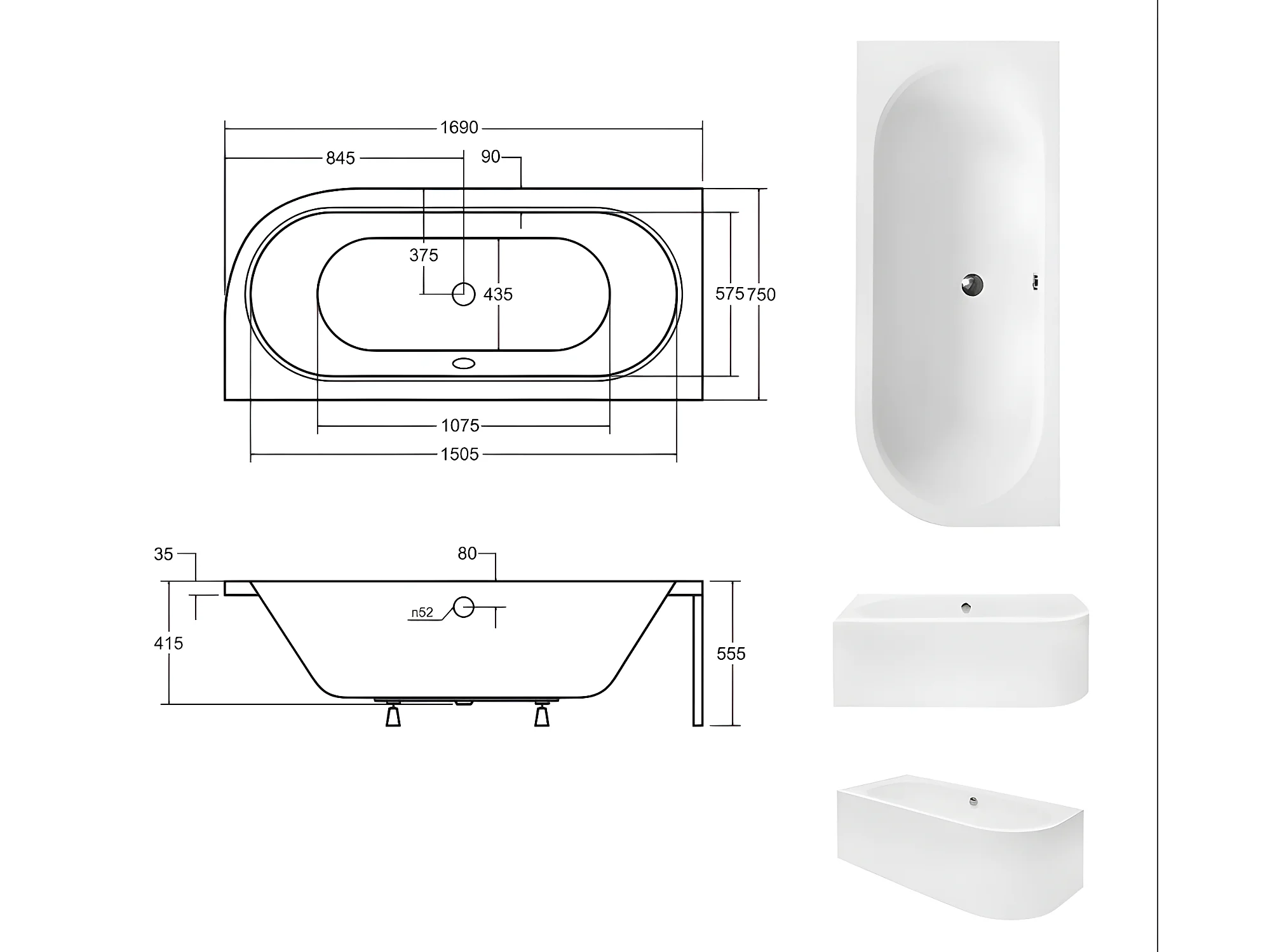 Baignoire HILIO GAUCHE avec tablier 150-160-170-180 - Dimensions: 170cm