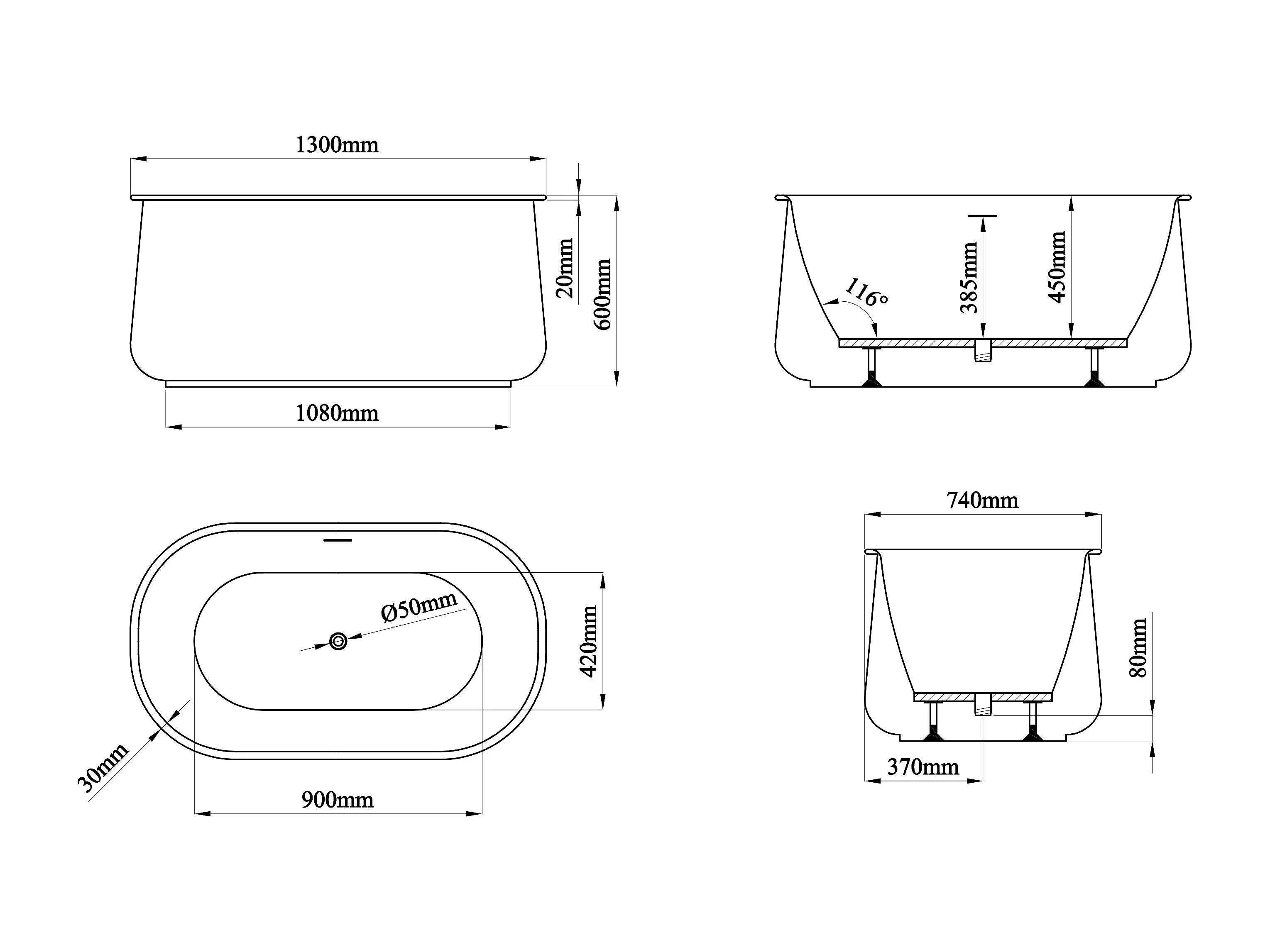 Baignoire îlot blanche mate - 130 x 74 x 60 cm - 195 L - CALDRIA